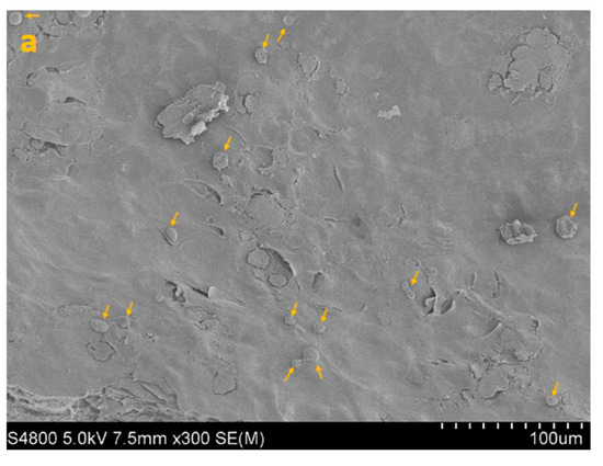 SEM imaging corroborated the quantitative data, showing sparser colonization with isolated trophozoites and decreased surface coverage in treated samples (Figure 3, Figure 4, Figure 5 and Figure 6).