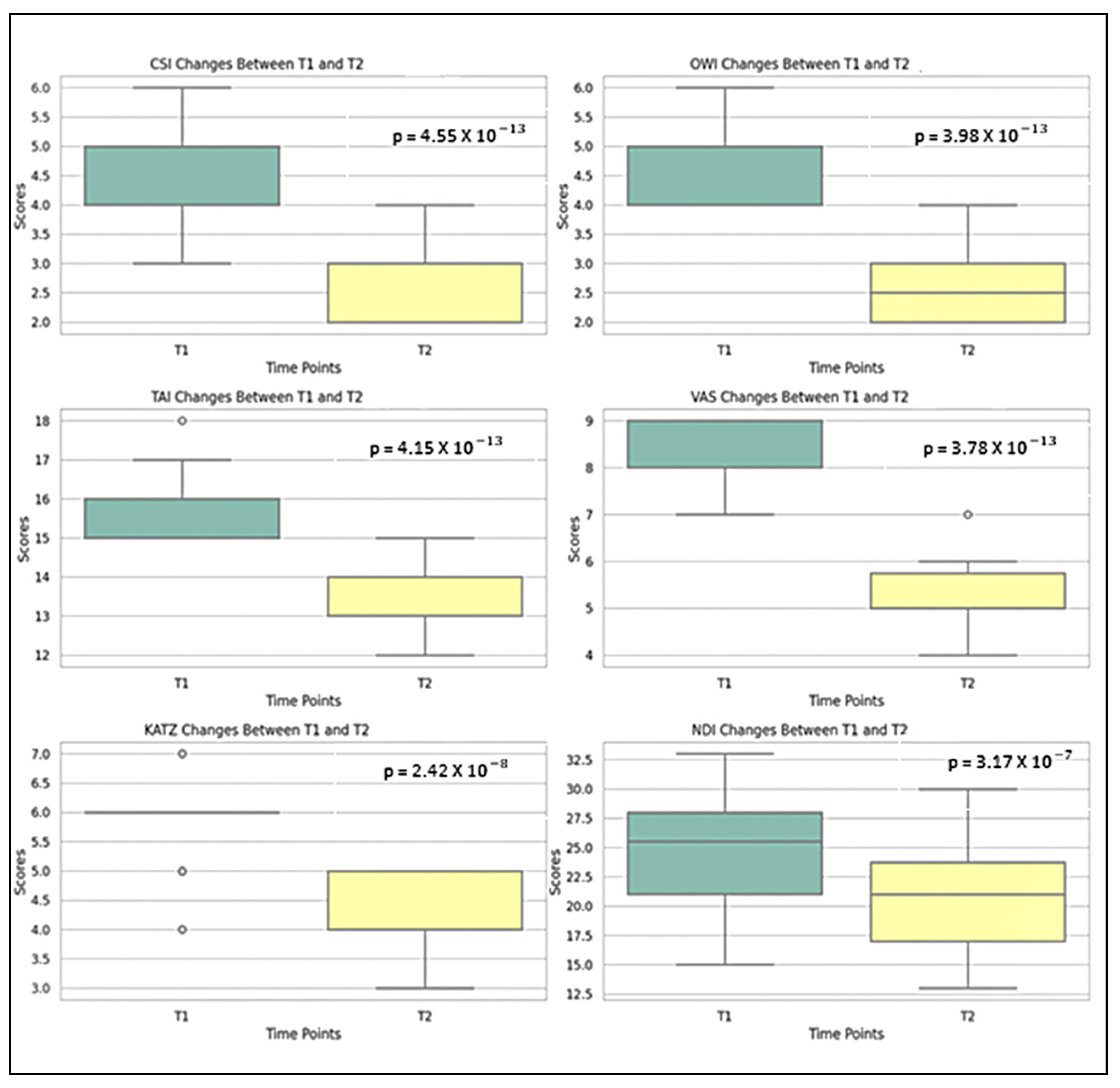 - Tragus-Acromion Index (TAI) scores were significantly reduced (p = 4.15 × 10−13), reflecting lower fear avoidance behaviors (the patient’s fear of mobilizing the head to avoid exacerbating symptoms) and increased confidence in movement.