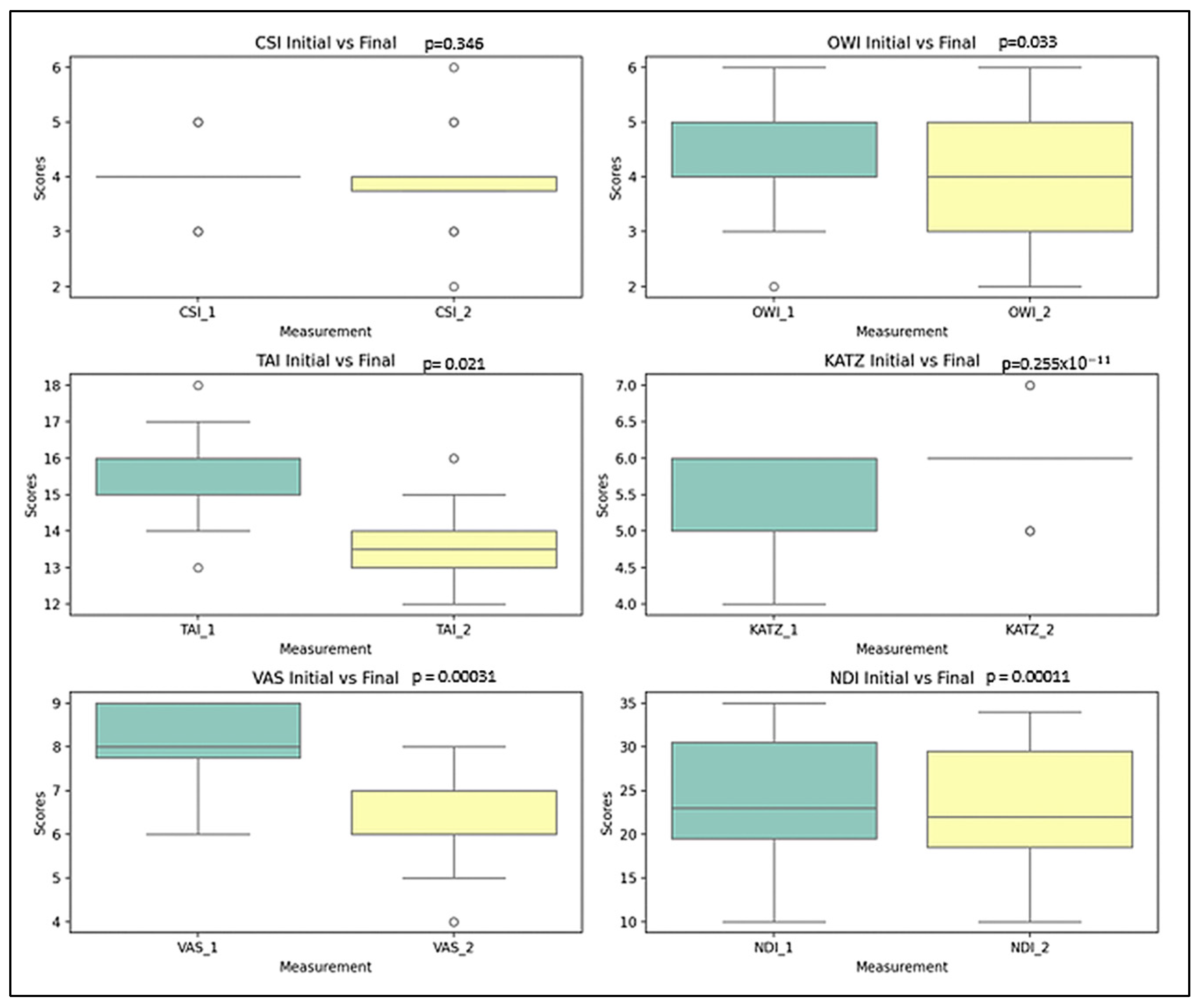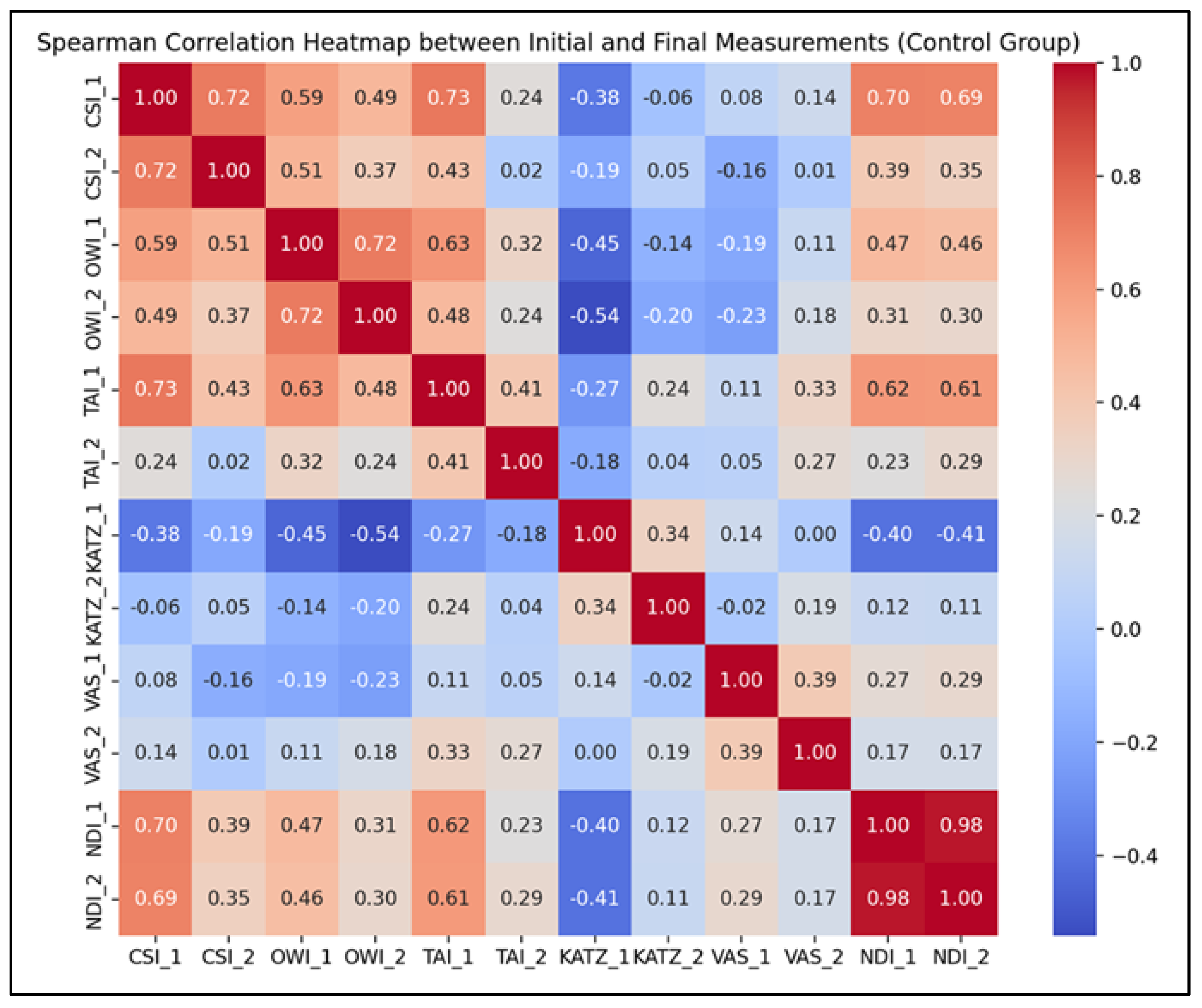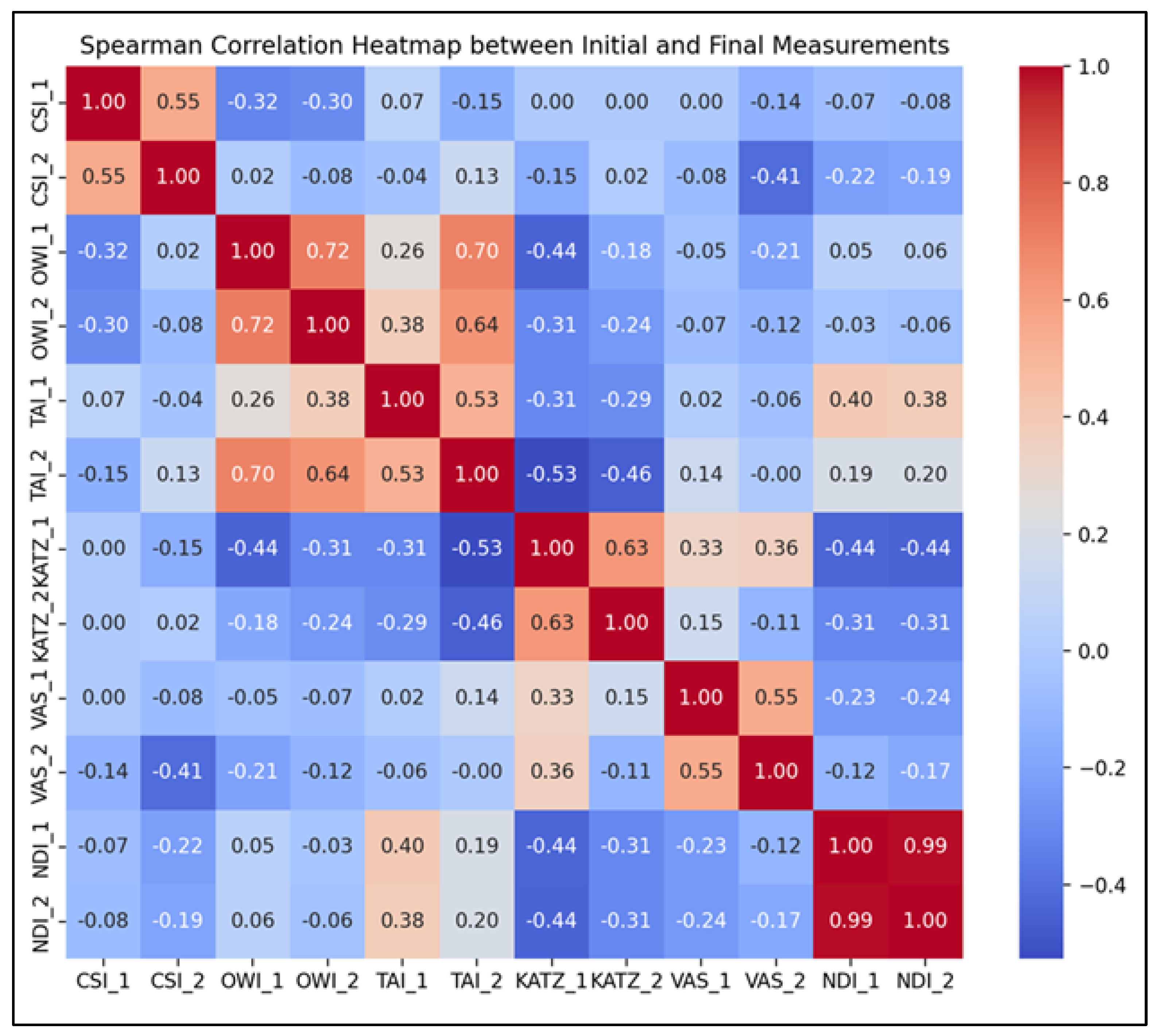 - Strong positive correlations were observed for CSI (r = 0.72, p < 0.001), OWI (r = 0.72, p < 0.001), and NDI (r = 0.98, p < 0.001), indicating that individuals’ initial values for these parameters were highly predictive of their corresponding final scores, even in the absence of a structured rehabilitation program.