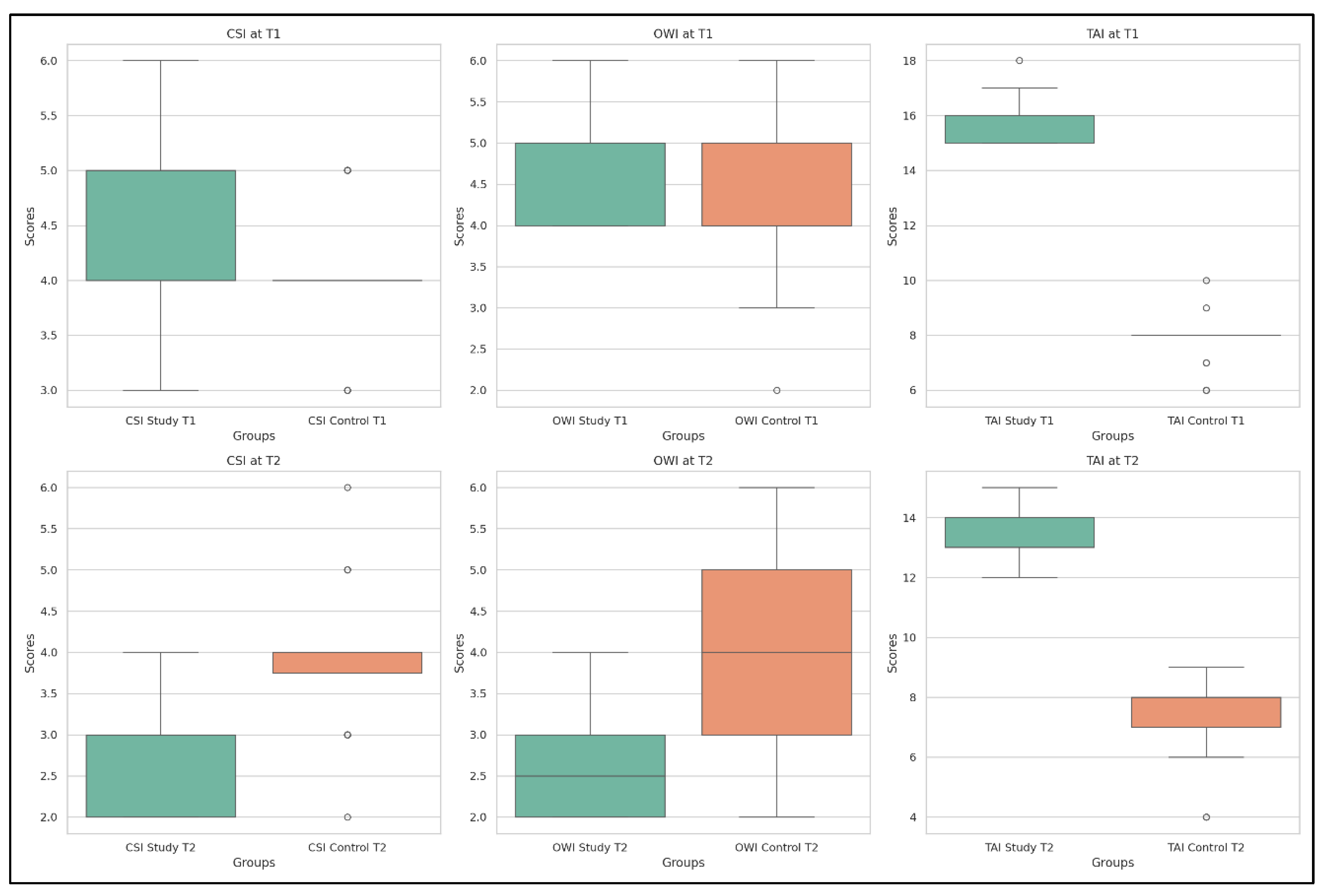 - Cervical Indexes: CSI (p = 7.92 × 10−11), OWI (p = 3.67 × 10−10), and TAI (p = 1.12 × 10−15); these highly significant changes favor the study group and support the beneficial impact of the therapeutic intervention on cervical posture and mobility.
