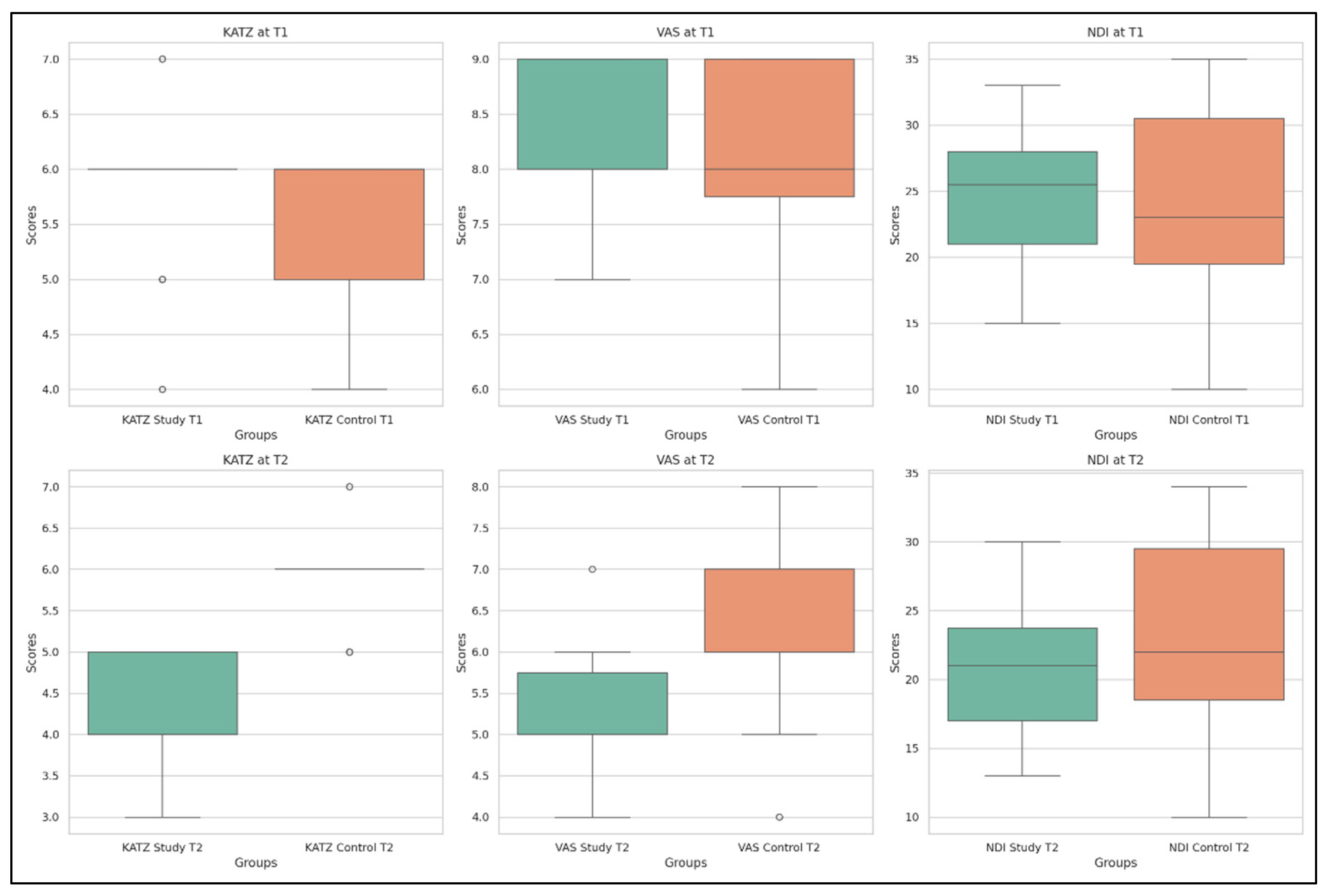 - Functional Symptom-related parameters: KATZ Index (p = 0.000167) and VAS (p = 8.91 × 10−8); these outcomes confirm the intervention’s positive effect on daily functioning and pain levels. No significant difference was found at T2 (p = 0.162) for NDI, suggesting comparable levels of neck disability across both groups despite improvements in other domains.