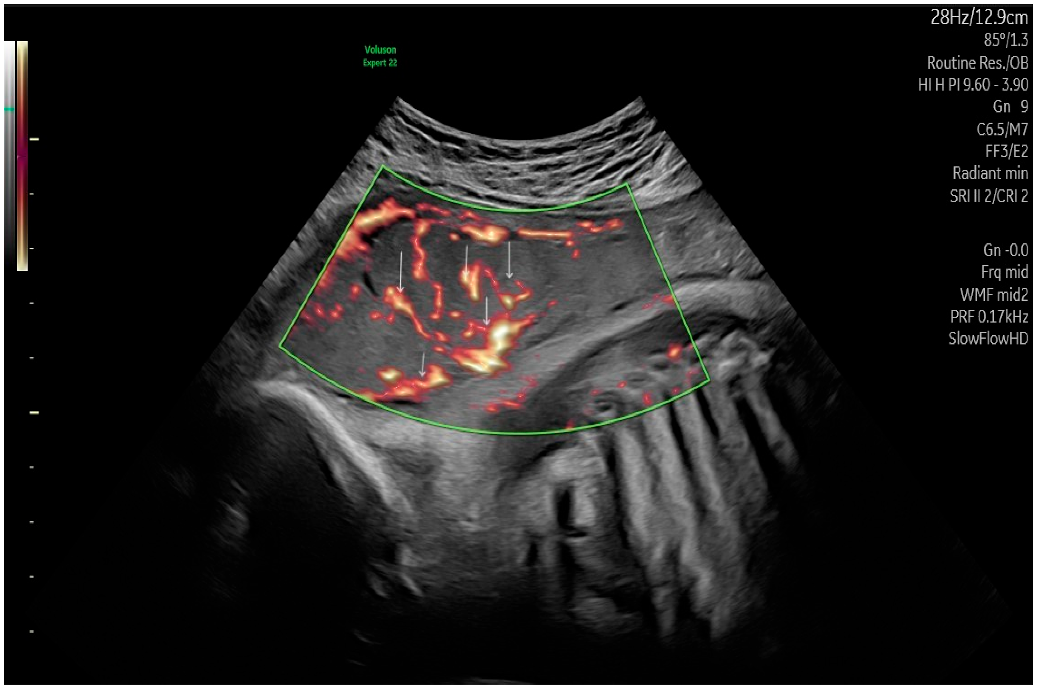 The vascularization index (VI), defined as the ratio of color voxels to total voxels, quantifies the presence of blood vessels within a given volume of interest and is expressed as a percentage (vascularity). The flow index (FI) represents the average color value of all color voxels, indicating the average intensity of blood flow on a scale from 0 to 100 (unitless). The vascularization flow index (VFI), calculated as the weighted ratio of color voxels to total voxels, merges information on vessel presence (vascularity) and the quantity of blood cells transported (unitless). The values range from 0 to 100. The VOCAL program calculates the 3-D power Doppler (3-DPD) indices (VI, FI, VFI) on the ground of the gathered samples.