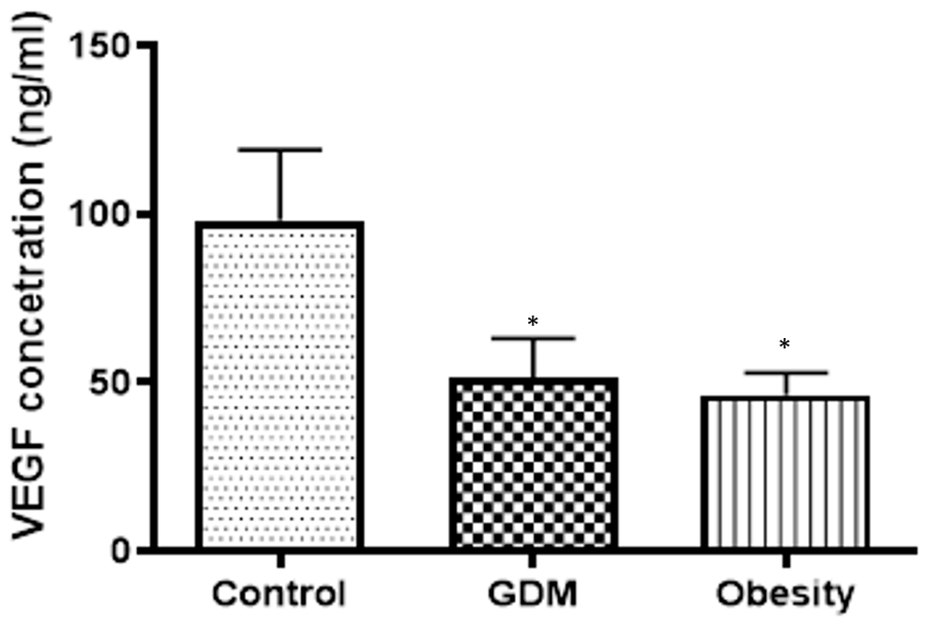 The reduced VEGF levels in the placenta are associated with impaired angiogenesis, placental dysfunction, and hypoxia. Possible long-term effects of insufficient placental VEGF include a decline in placental vascularization and edema, resulting in poor placental function and placentomegaly. Our results showed that VEGF decline was significantly associated with both obesity and GDM. In any case, obesity led to a greater inclination in VEGF concentration, and GDM led to a greater inclination in placental function and edema. A decreased VEGF concentration in the placenta may be a critical marker indicating underlying problems with placental function. This necessitates careful monitoring.