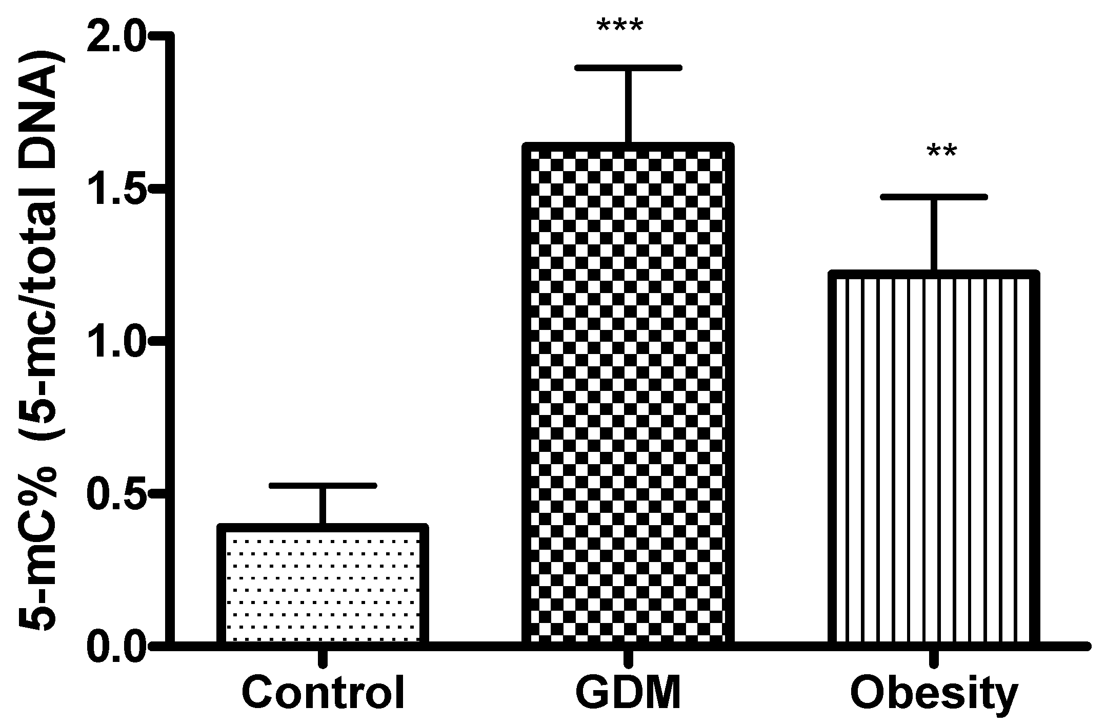 33]. In our study, DNA methylation was significantly higher in GDM and obese patients compared with the control. This can be explained by the specific diabetes-related metabolic and hormonal modifications during pregnancy. These changes may affect gene expression differently than obesity alone. GDM-specific factors, such as altered insulin and glucose levels, hormonal fluctuations, and inflammation, can lead to various epigenetic modifications. These modifications may affect the genes involved in glucose metabolism, subacute inflammation, and placental function, resulting in more pronounced DNA methylation changes in GDM than in obesity, which primarily represents chronic metabolic stress.