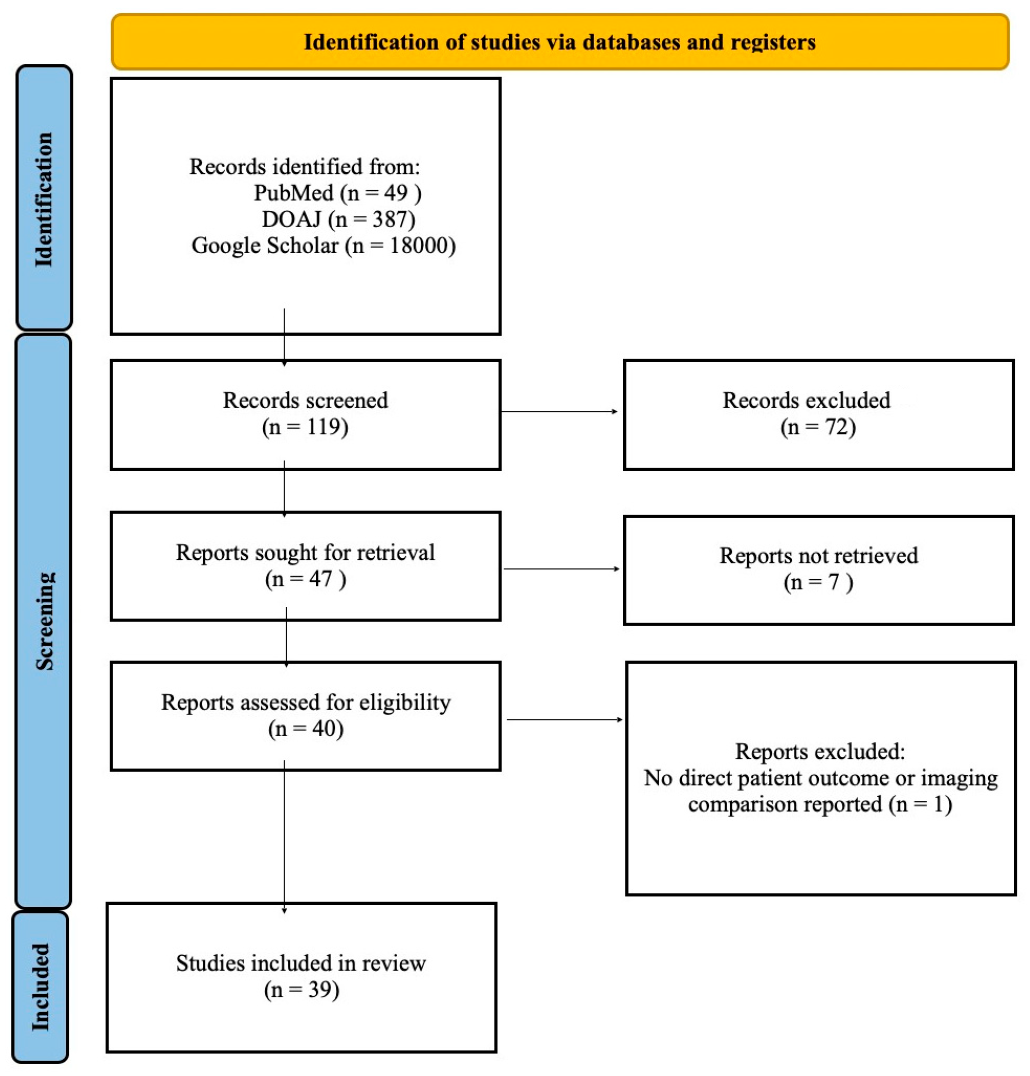 During the initial search of databases, we found 49 results on PubMed, 387 on DOAJ, and over 18,000 in Google Scholar. Of these, 119 were initially evaluated by title and abstract, and 72 were excluded due to ineligibility. Of the 47 that remained, only 40 were open-access; one was excluded because its primary focus was not on clinical outcomes but on machine learning. We included articles published in the last eleven years (2014–2025) in our paper.