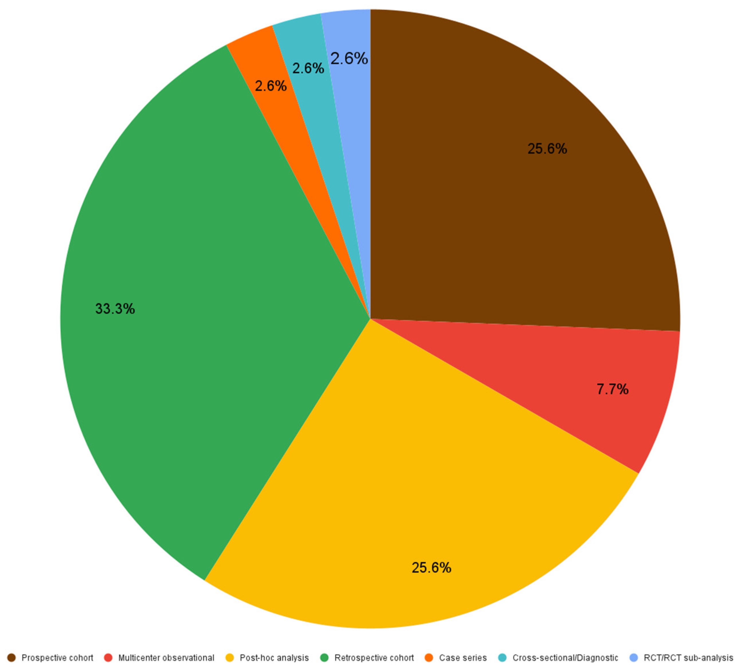 Figure 2 demonstrates that out of 39 included articles, 33.3% (13 articles) were designed as retrospective studies, 25.6% (10) were prospective studies as much as post-hoc analyses, 7.7% (3) were multicenter observational studies, while RCT/RCT sub-analyses, cross-sectional studies and case series represented 2.6% (1) each.