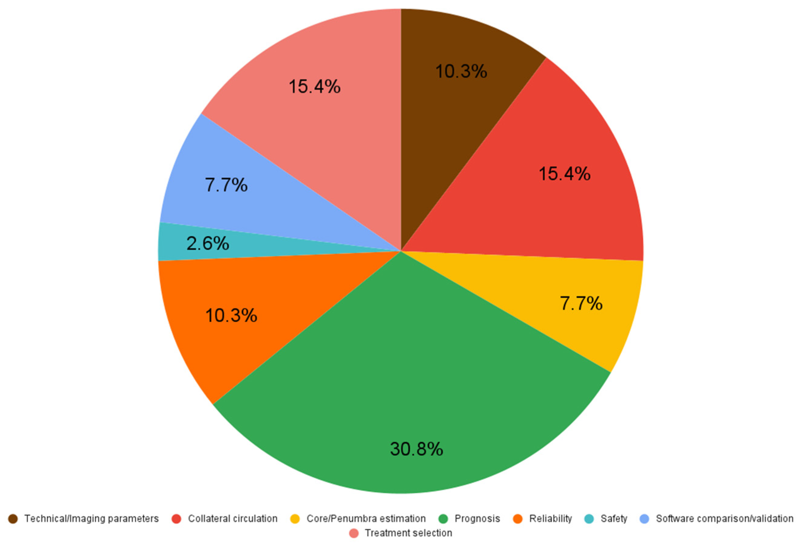 The studies included have been grouped by their main objective in eight thematic categories: core/penumbra estimation, software comparison/validation, treatment selection, technical/imaging parameters, collateral circulation, prognosis, safety, and reliability, and the main results were compared in a descriptive manner, as this paper doesn’t represent a statistical analysis.