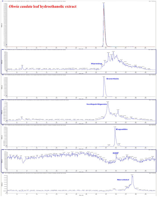 HPLC–MS chromatogram of the hydroethanolic extract of Ohwia caudata leaves. The extract was prepared by sonication of 10 g of dried Ohwia caudata leaves in 200 mL 75% ethanol for 1 h, followed by filtration and centrifugation. Analysis was performed using a high-performance liquid chromatography system coupled with tandem mass spectrometry (HPLC–MS). Major bioactive compounds identified in the extract included harmine, swertisin, isoliquiritigenin, eupatilin, 3′,4′-dimethoxyflavone (DMF), and nerolidol.