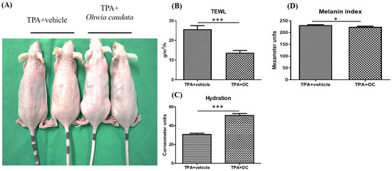 The deleterious effects of TPA on the skin were mitigated by the Ohwia caudata leaf hydroethanolic extract. (A) Representative dorsal skin images of SKH1/J hairless mice from the control, TPA-stimulated, and TPA plus extract-treated groups. (B–D) Quantitative analysis of transepidermal water loss (TEWL), stratum corneum hydration, and melanin index measured using a multi-probe adapter system (Courage + Khazaka, Cologne, Germany) after 7 days of treatment (n = 6 per group). Data are expressed as mean ± SEM. Statistical analysis was performed using Student’s t-test. * p < 0.05; *** p < 0.001. OC: Ohwia caudata leaf hydroethanolic extract.