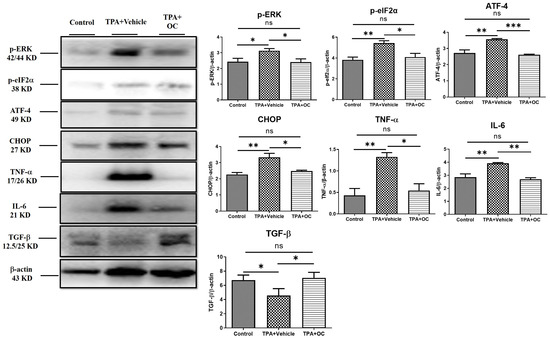 Ohwia caudata leaf hydroethanolic extract attenuates TPA-induced skin inflammation through suppression of the ERK signaling pathway. Dorsal skin samples from control, TPA-stimulated, and TPA plus extract-treated SKH1/J hairless mice (n = 3 per group) were analyzed by immunoblotting. Protein expression levels of IL-6, TNF-α, TGF-β, phosphorylated ERK (p-ERK), phosphorylated eIF2α (p-eIF2α), ATF-4, and CHOP were evaluated, with β-actin used as a loading control. Data represent mean ± SEM from three independent experiments. Statistical analysis was performed using one-way ANOVA followed by Tukey’s multiple comparisons test. ns: no significant difference; * p < 0.05; ** p < 0.01; *** p < 0.001. OC: Ohwia caudata leaf hydroethanolic extract.