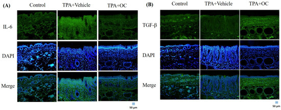 Immunoblotting and immunofluorescence staining were performed to assess inflammatory cytokines in dorsal skin, which showed no significant changes in the protein microarray. TPA stimulation markedly increased IL-6 (p < 0.01) and TNF-α (p < 0.01) expression compared with the control group, whereas treatment with Ohwia caudata leaf hydroethanolic extract reversed these elevations (IL-6, p < 0.01; TNF-α, p < 0.05 compared with the TPA-stimulated group; Figure 3). Immunofluorescence images further confirmed that IL-6 signals were elevated in TPA-treated skin and reduced following extract administration (Figure 4A). These results demonstrate that Ohwia caudata leaf hydroethanolic extract suppresses TPA-induced proinflammatory cytokine expression, thereby mitigating acute contact dermatitis. In addition, TGF-β, a key immunoregulatory cytokine involved in repressing immune responses [30,31], was examined. Both immunoblotting and immunofluorescence analyses also showed that TPA stimulation reduced TGF-β expression (p < 0.05) compared with the control group, whereas treatment with the extract restored TGF-β levels (p < 0.05 compared with the TPA-stimulated group; Figure 3 and Figure 4B). Restoration of this cytokine suggests that the extract modulates immune balance in addition to suppressing proinflammatory cytokines. Collectively, these findings indicate that Ohwia caudata leaf hydroethanolic extract exerts anti-inflammatory effects through a dual mechanism: downregulation of IL-6 and TNF-α and restoration of TGF-β expression, thereby alleviating TPA-induced skin inflammation.