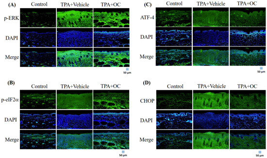 Previous studies have indicated that the ERK signaling pathway contributes to the pathogenesis of atopic dermatitis and that suppression of ERK activity alleviates disease severity [32]. Furthermore, ERK activation can be triggered by TPA stimulation [33,34]. To investigate this pathway, the p-ERK level was analyzed by immunoblotting and immunofluorescence staining. TPA treatment significantly increased p-ERK expression (p < 0.05) compared with the control group, whereas this elevation was attenuated following Ohwia caudata leaf hydroethanolic extract treatment (p < 0.05 compared with the TPA-stimulated group; Figure 3 and Figure 5A). The expression of downstream ERK-regulated proteins—including p-eIF-2α [35], ATF-4 [35,36], and CHOP [36]—was also examined. TPA stimulation markedly increased all three proteins (p-eIF-2α, p < 0.01; ATF-4, p < 0.01; CHOP, p < 0.01) compared with the control group, whereas treatment with Ohwia caudata leaf hydroethanolic extract significantly reduced their expression (p-eIF-2α, p < 0.05; ATF-4, p < 0.001; CHOP, p < 0.05 compared with the TPA-stimulated group; Figure 3 and Figure 5B–D). These results indicate that Ohwia caudata leaf hydroethanolic extract reduces TPA-induced activation of the ERK signaling pathway in the skin.