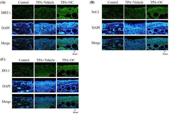 Ohwia caudata leaf hydroethanolic extract activates the SIRT1/Nrf2/HO-1 antioxidative pathway in TPA-induced dermatitis. Immunofluorescence staining of dorsal skin sections (4 μm thick) from control, TPA-stimulated, and TPA plus extract-treated SKH1/J hairless mice (n = 6 per group) was conducted to assess (A) SIRT1, (B) Nrf2, and (C) HO-1 expression. Alexa Fluor® 488-conjugated antibodies were used, and nuclei were counterstained with DAPI. Fluorescence images were captured using an OLYMPUS BX53 microscope. Scale bar = 50 μm. OC: Ohwia caudata leaf hydroethanolic extract. The target proteins were visualized using green fluorescence and the cell nuclei were stained with blue fluorescence (DAPI).