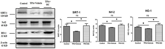 Ohwia caudata leaf hydroethanolic extract enhances antioxidant protein expression in TPA-induced dermatitis. Dorsal skin lysates from control, TPA-stimulated, and TPA plus extract-treated SKH1/J hairless mice (n = 3 per group) were analyzed by immunoblotting for SIRT1, Nrf2, and HO-1 expression. β-actin served as a loading control. Densitometric values are expressed as mean ± SEM from three independent experiments. Statistical analysis was performed using one-way ANOVA followed by Tukey’s multiple comparisons test. ns: not significant; * p < 0.05. OC: Ohwia caudata leaf hydroethanolic extract.