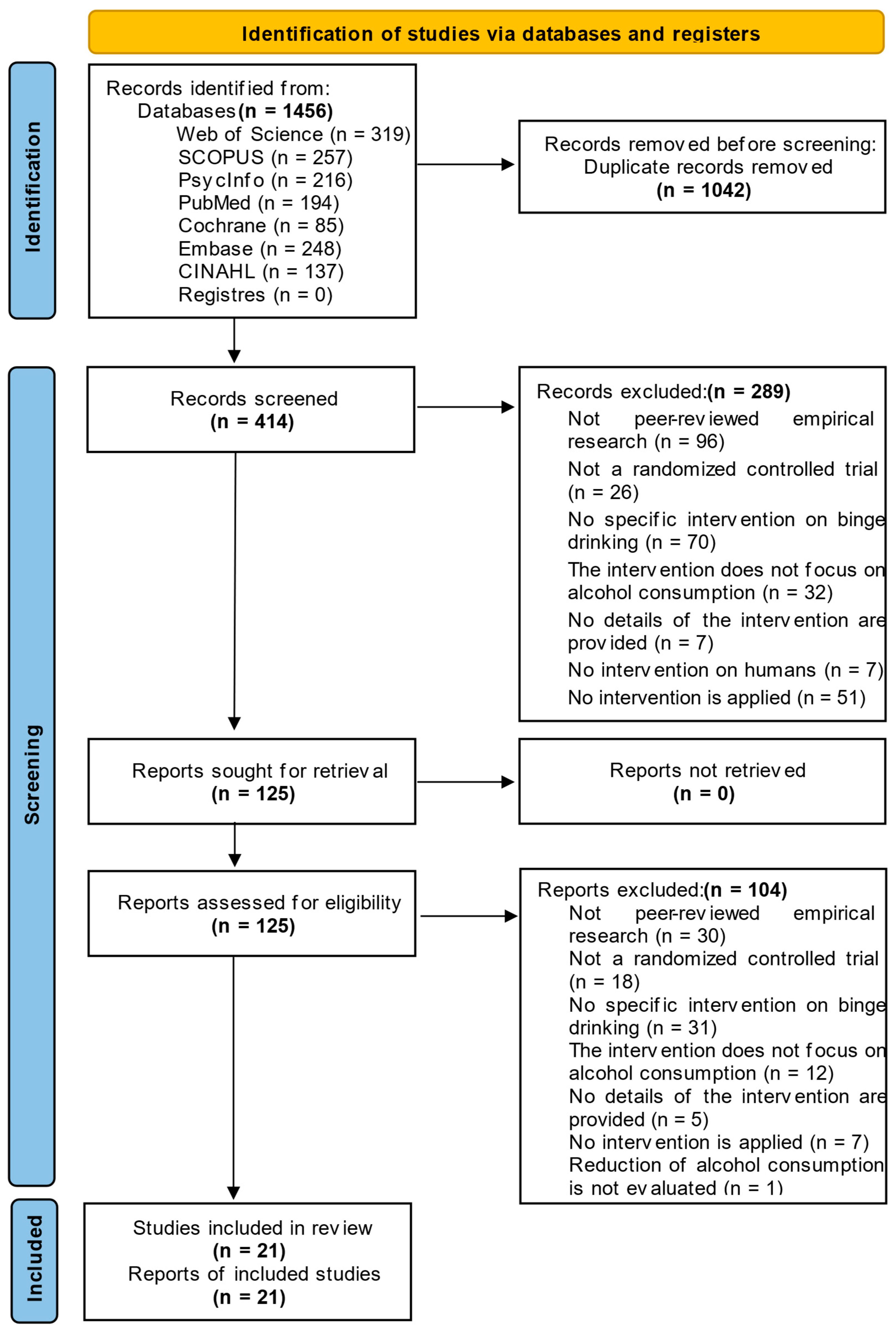 An exhaustive search of several databases yielded a total of 1456 results. After removing 1042 duplicates, the sample was reduced to 414 records to be reviewed and selected. After reading the title and abstract, 289 were discarded for various reasons: 96 were not peer-reviewed empirical studies; 26 did not use a randomized controlled trial; 70 did not use specific interventions in BD; 32 did not develop interventions focused on alcohol consumption; seven did not provide details of the intervention; seven were not studies conducted in humans, and 51 did not apply any intervention. Subsequently, the full text of the 125 selected studies was reviewed to determine whether they met the eligibility requirements, and a total of 104 were discarded. The reasons for exclusion were that they were not peer-reviewed empirical studies (n = 30); they did not use a randomized controlled trial (n = 18); they did not specifically target BD (n = 31); the intervention developed did not focus on alcohol consumption (n = 12); did not provide details about the intervention (n = 5); did not apply any intervention (n = 7); and did not provide any assessment of the reduction in alcohol consumption (n = 1). Finally, 21 studies were included in the review, which formed the basis for the final analysis.