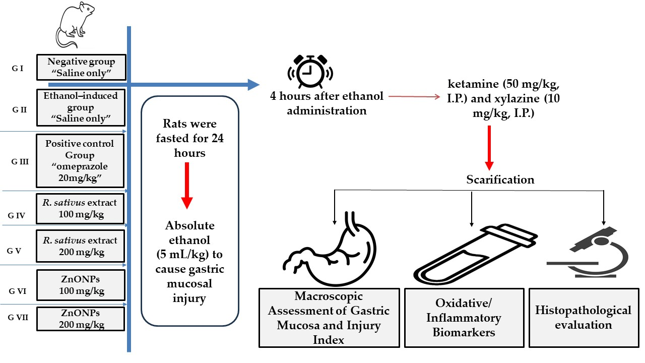 Alsayed, D.K.; El-Hawary, S.S.; El Raey, M.A.; Fouad, G.; Abdelhameed, M.F.; Essa, A.F.; Ahmed, Y.H.; Alshehri, S.A.; Rabeh, M.A.; Elmotayam, A.K. Phyto-Mediated Zinc Oxide Nanoparticles from Raphanus sativus (L.): Metabolomic Insights, Gastroprotective Potential, and Docking-Supported Evidence. Life 2025, 15, 1710. https://doi.org/10.3390/life15111710