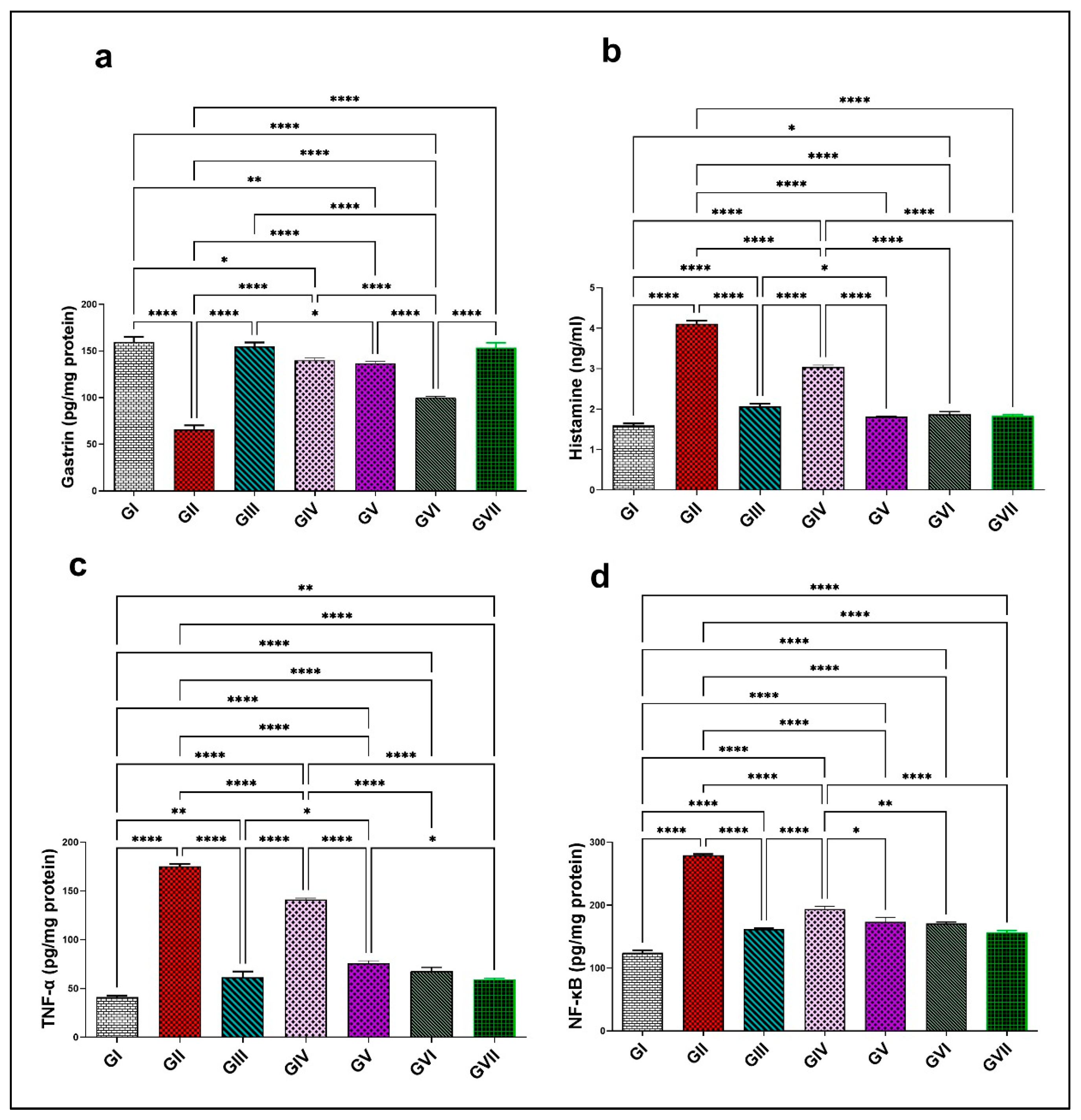 3.3.4. Assessment of Gastric Secretions and Inflammatory Biomarkers (Gastrin, Histamine, TNF-α, and NF-κB)
