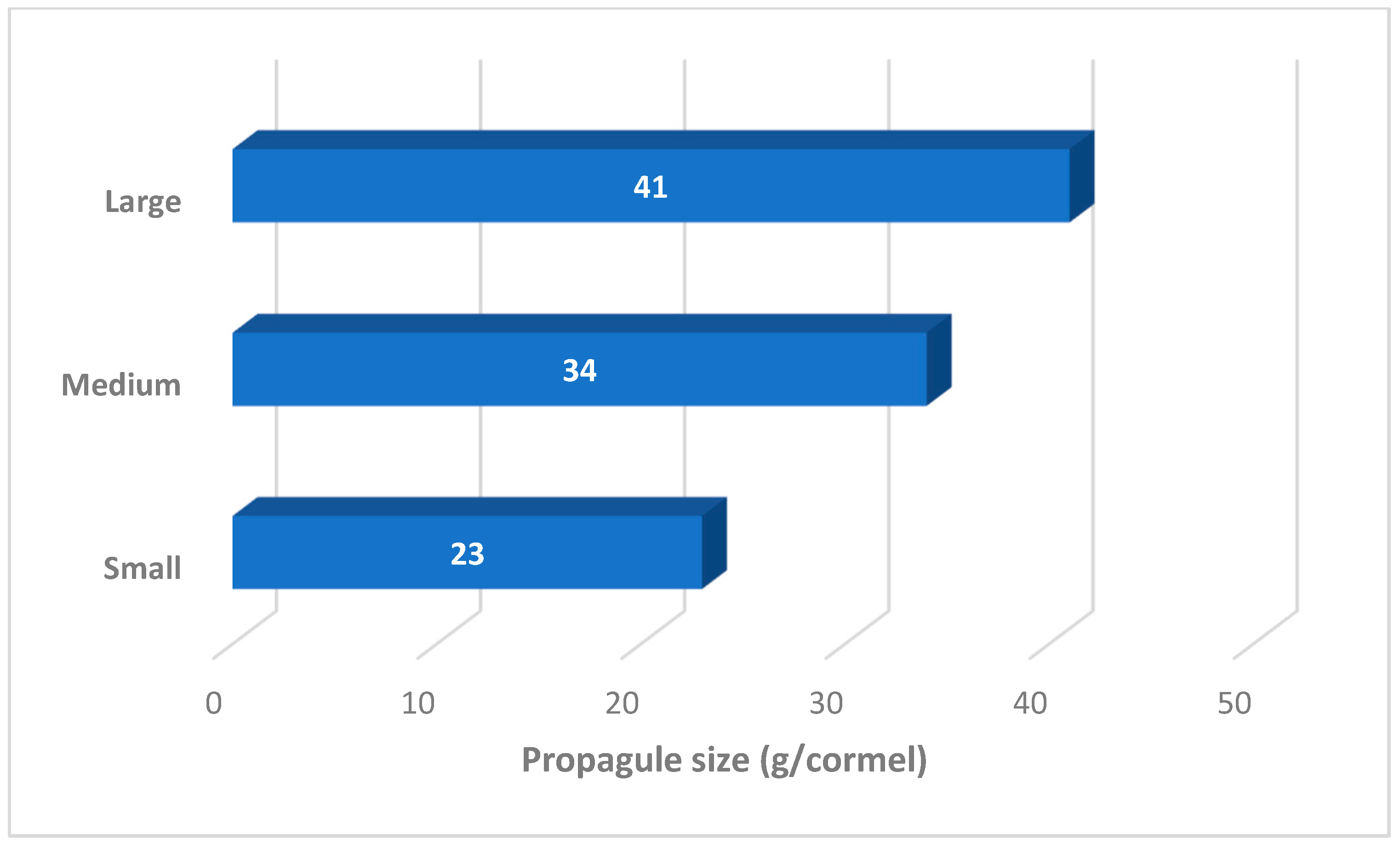 17]. Planting corms were originally collected from 100 farmers in Umbumbulu (29.9889 S, 30.7003 E), South Africa, more than 60 km from the study location (Pietermaritzburg), where the germplasm was preserved in situ for propagule preparation. Propagules were separated based on morphometric parameters [