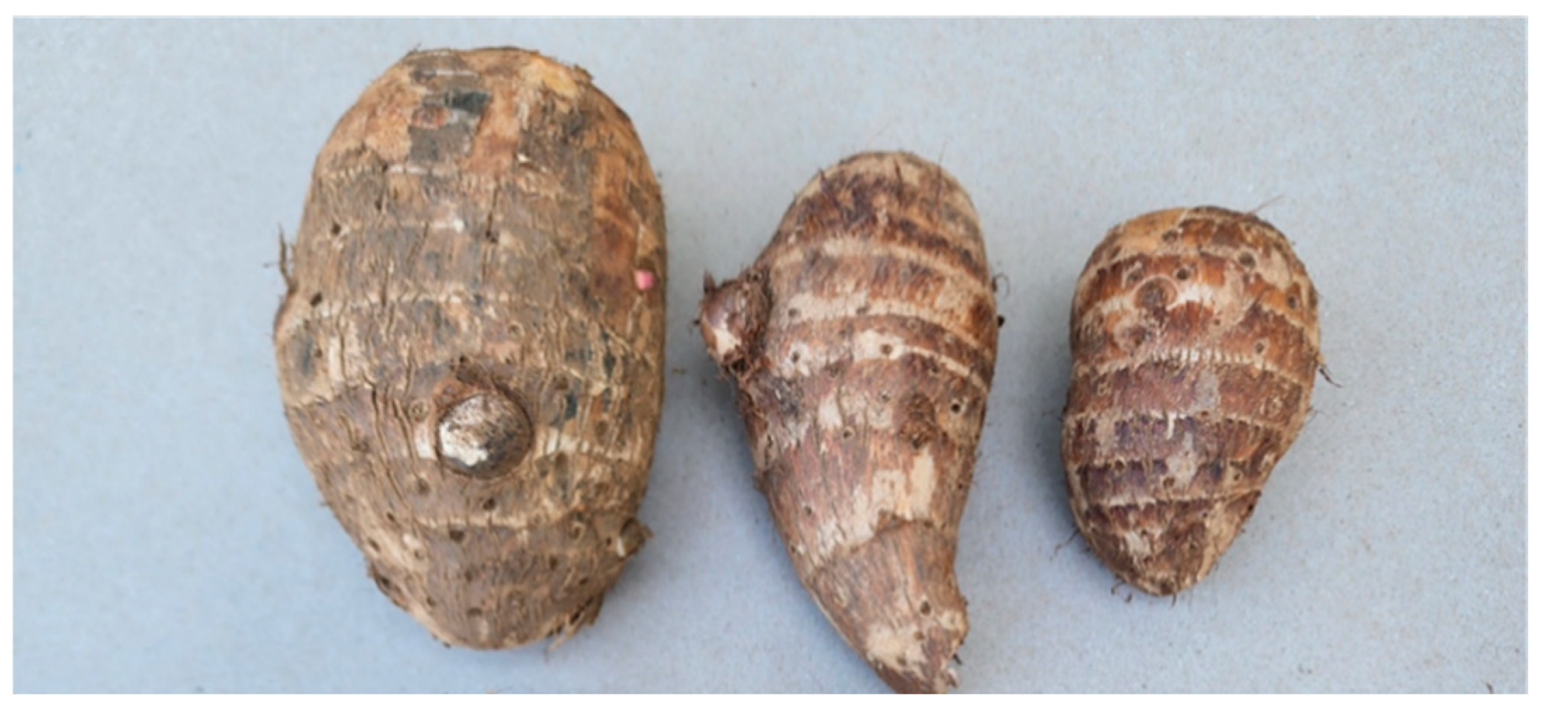 18]. Morphometric measurements of taro corms include key dimensions typically assessed in agricultural and botanical studies. These are corm length (from top to bottom), corm diameter (widest horizontal section), corm weight (usually measured separately) and shape characteristics (e.g., cylindrical, conical or irregular). Corm uniformity variation is expected for landrace germplasm [