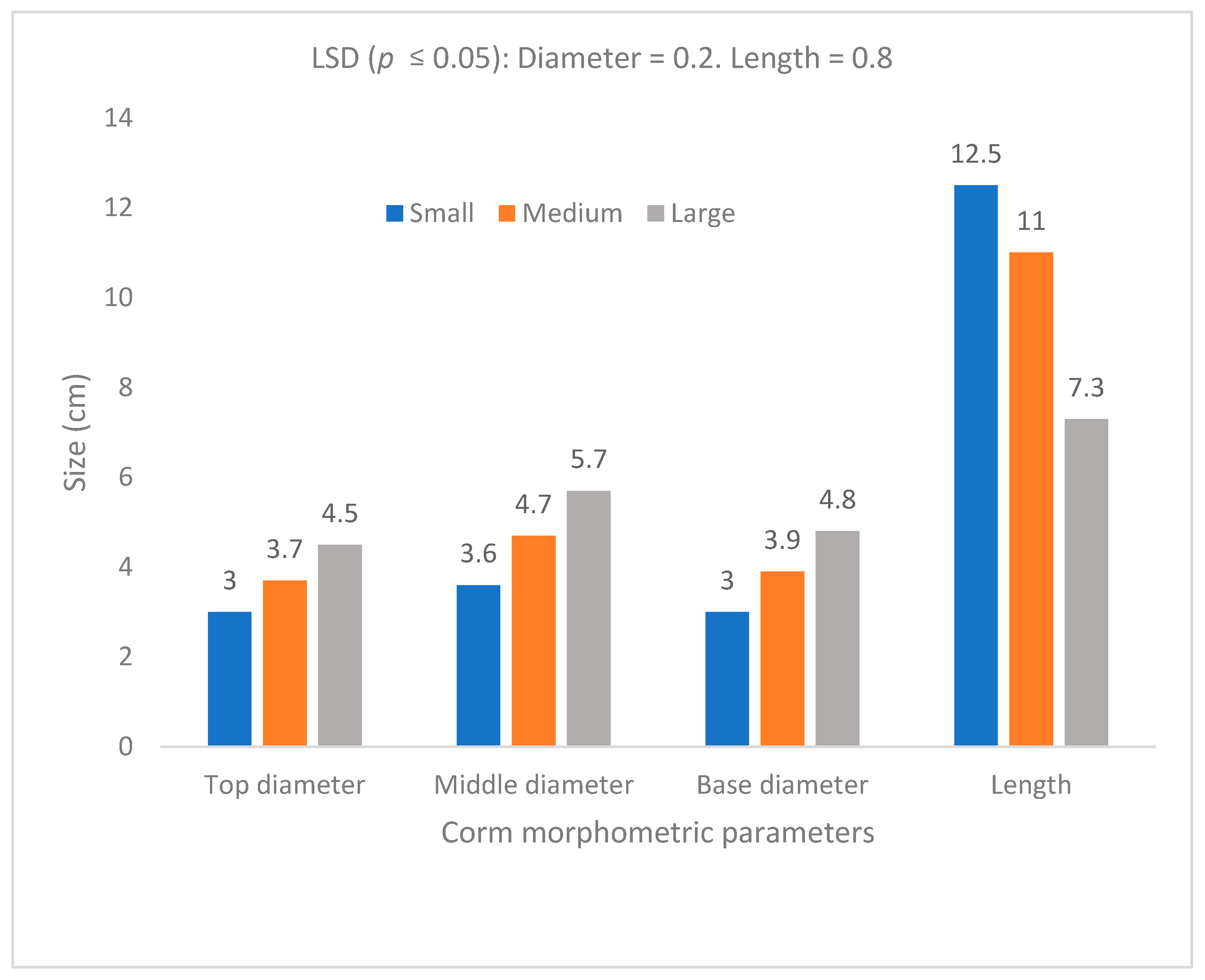 p ≤ 0.05) between corm sizes (large, medium, small) with respect to length and diameter morphometrics, irrespective of corm position (