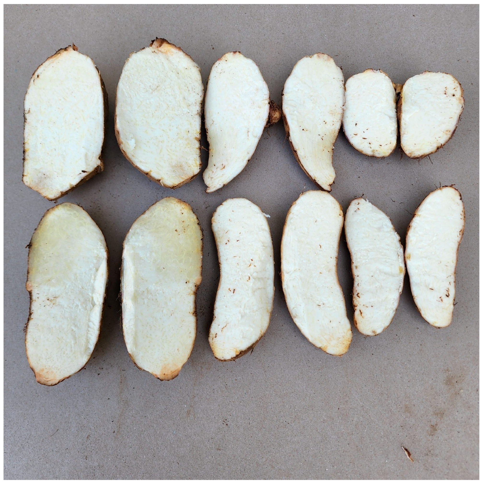 25]. Previous studies showed that medium-sized seed potatoes (typically 50–80 g) often yield better. Very small seed pieces may result in weak plants, while very large ones may be uneconomical and prone to disease. Field trials often compare whole vs. cut seed potatoes and different size classes (e.g., <30 g, 30–50 g, 50–80 g, >80 g). However, the results also vary with variety, soil type, climate and management practices. Medium-sized seed pieces generally offer the best performance in terms of yield per hectare. These findings were shown for taro in the current study.