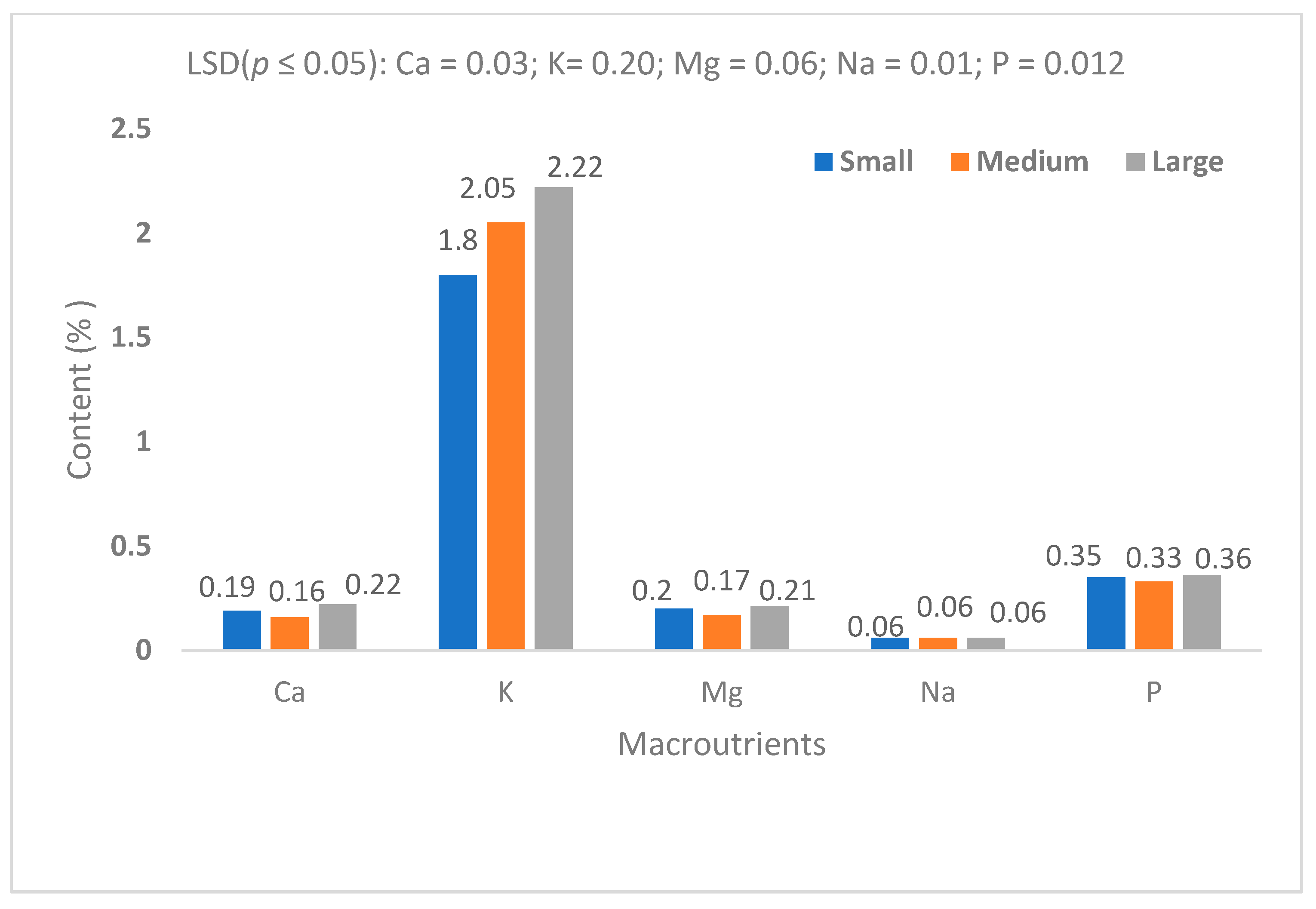 Figure 8). Sodium (Na) was the macronutrient found in the lowest concentrations, followed by Mg and Ca when corms produced from all propagule sizes were compared. The copper (Cu) concentration was found to be the lowest among micronutrients compared with Mn, Zn and Fe (