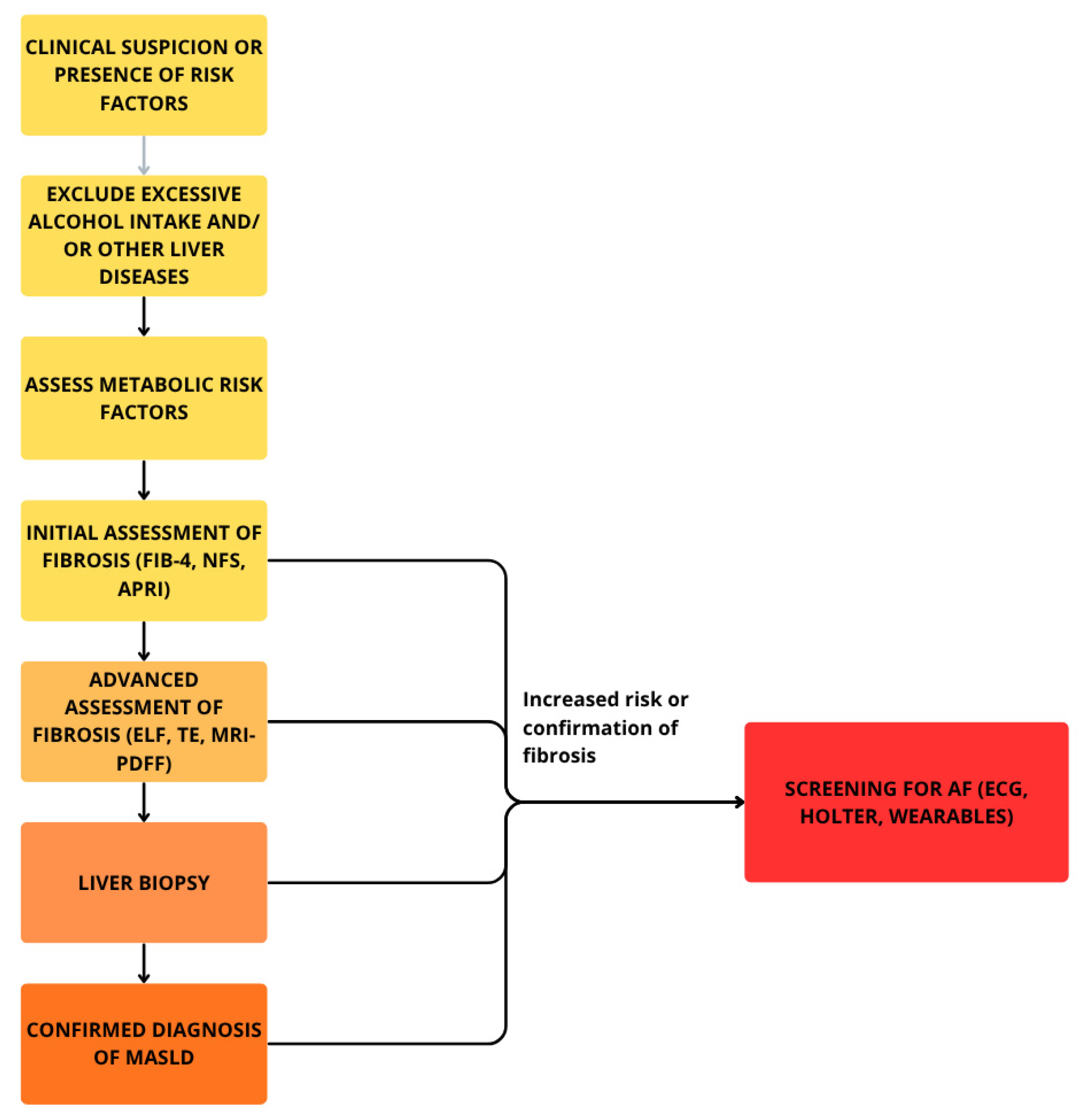 Chicago/Turabian StyleMorawska, Agata, Rafał Frankowski, Mikołaj Grabarczyk, Marcin Kosmalski, and Monika Różycka-Kosmalska. 2025. "Crosstalk Between Metabolic Dysfunction-Associated Steatotic Liver Disease and Atrial Fibrillation: Shared Mechanism, Diagnostic Integration, and Management Implications" Life 15, no. 11: 1713. https://doi.org/10.3390/life15111713