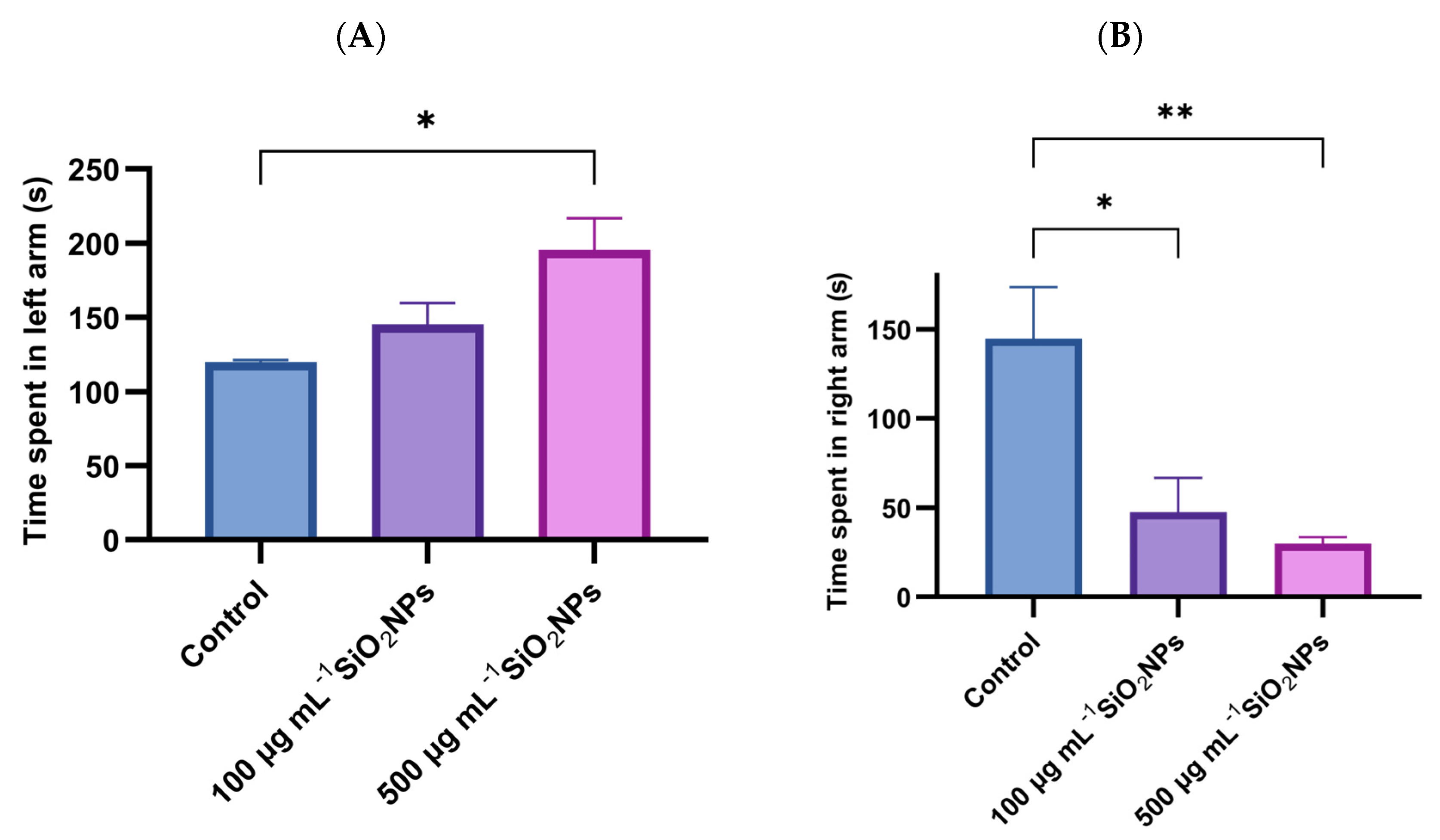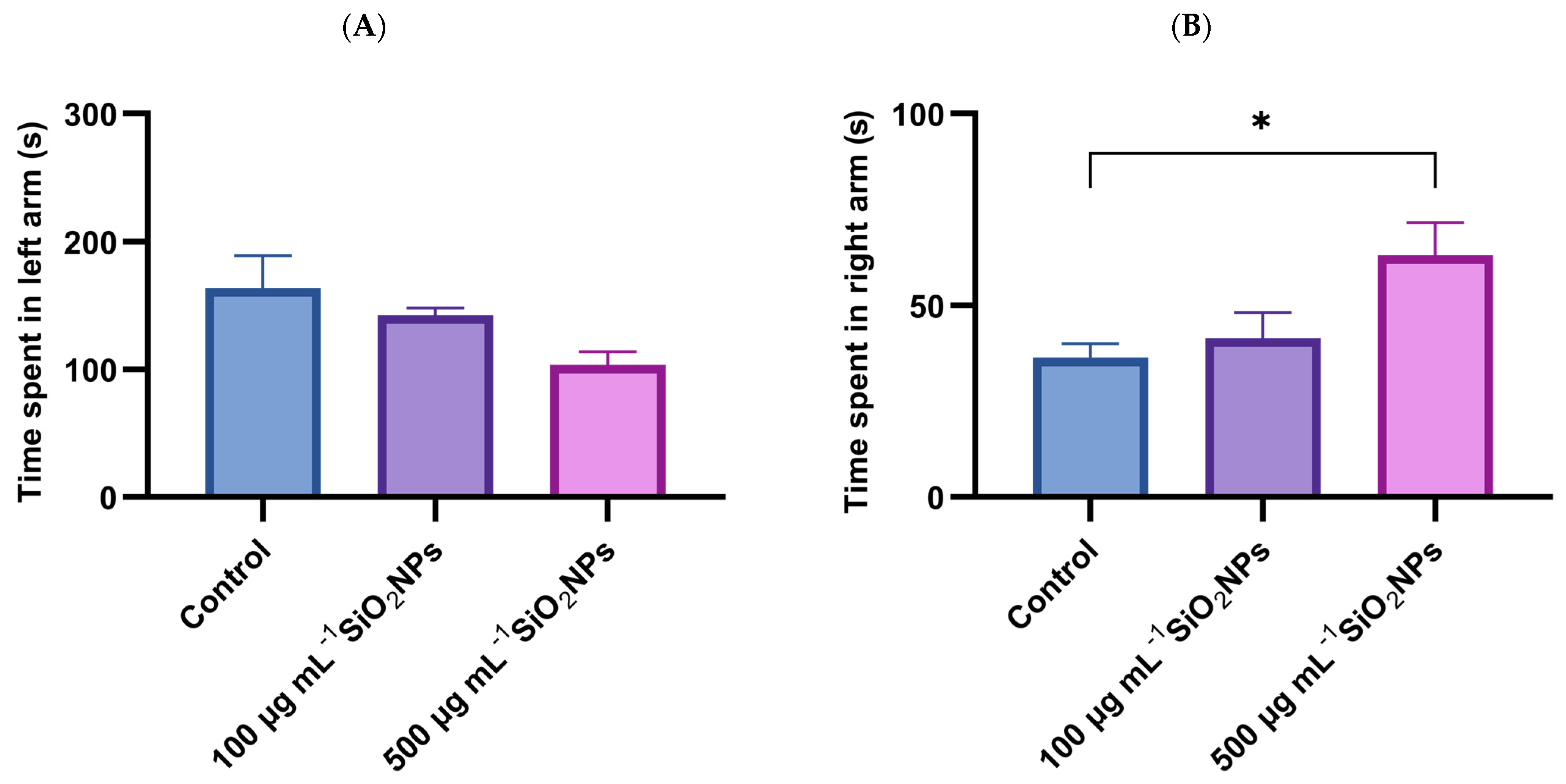 - Li, X.; Liu, B.; Li, X.-L.; Li, Y.-X.; Sun, M.-Z.; Chen, D.-Y.; Zhao, X.; Feng, X.-Z. SiO2 nanoparticles change colour preference and cause Parkinson’s-like behaviour in zebrafish. Sci. Rep. 2014, 4, 3810. [Google Scholar] [CrossRef] [PubMed]