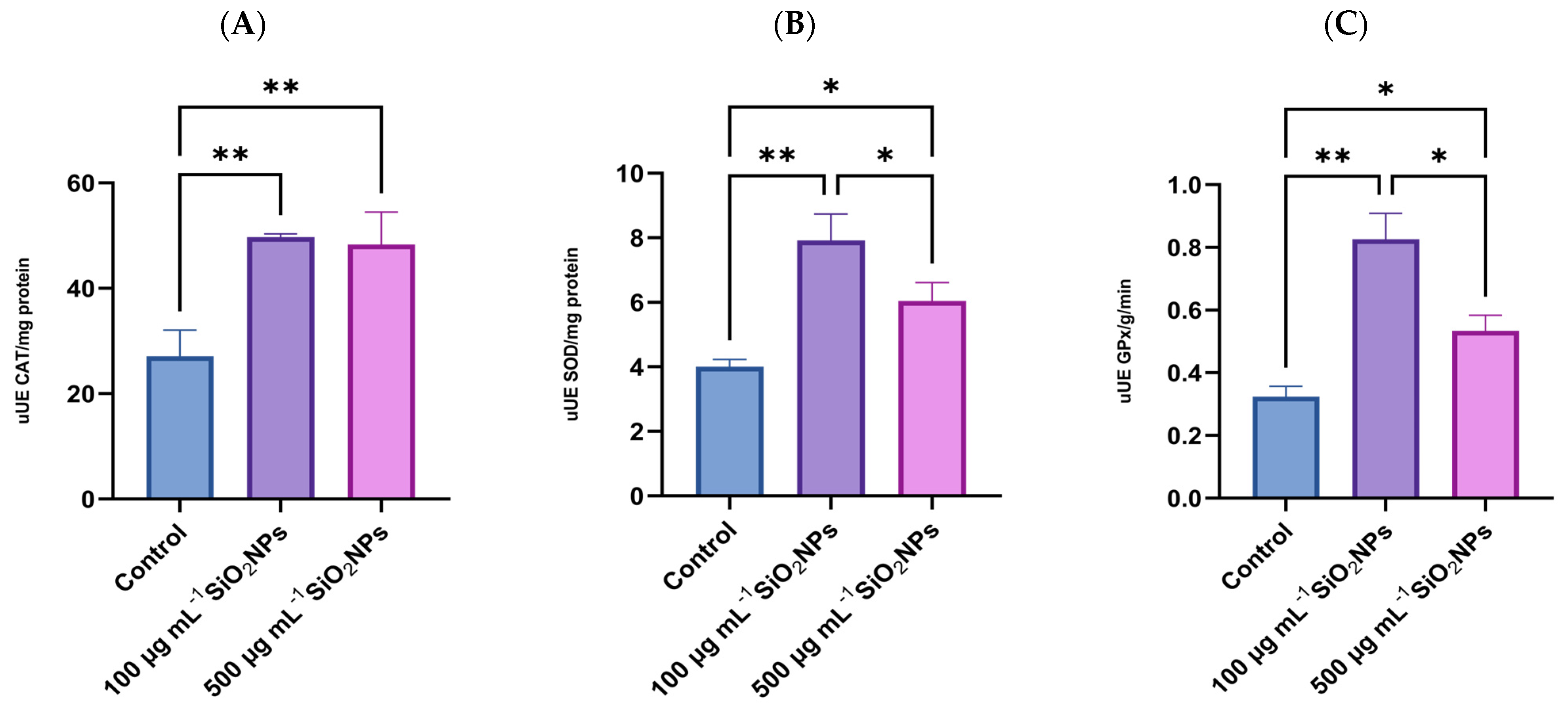 - Sinha, A.K. Colorimetric assay of catalase. Anal. Biochem. 1972, 47, 389–394. [Google Scholar] [CrossRef]