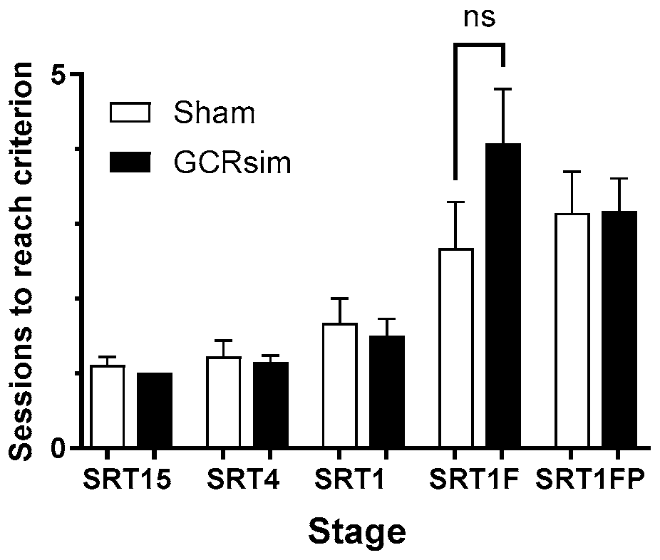 - Britten, R.A.; Fesshaye, A.; Tidmore, A.; Liu, A.; Blackwell, A.A. Loss of Cognitive Flexibility Practice Effects in Female Rats Exposed to Simulated Space Radiation. Radiat. Res. 2023, 200, 256–265. [Google Scholar] [CrossRef] [PubMed]