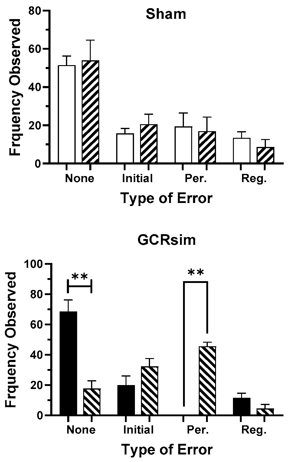 - Britten, R.A.; Fesshaye, A.; Tidmore, A.; Blackwell, A.A. Similar Loss of Executive Function Performance after Exposure to Low (10 CGy) Doses of Single (4He) Ions and the Multi-Ion GCRSim Beam. Radiat. Res. 2022, 198, 375–383. [Google Scholar] [CrossRef]