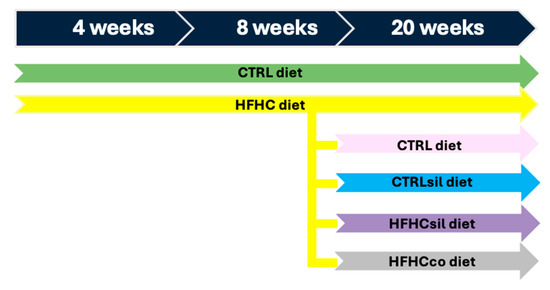 In vivo experimental setup. The experiments started at 3 weeks of age (after weaning), and the animals were divided into two groups, one fed the CTRL (green arrow) diet and the other fed the high-fat high-carbohydrate (HFHC) (yellow arrow) diet, for a total of 8 weeks. After 8 weeks of treatment, the CTRL group and part of the HFHC group were fed the original diets and served as controls (CTRL→CTRL; green arrow; HFHC→HFHC; yellow arrow), whereas the rest of the HFHC group was divided into four groups. These groups were switched to the CTRL diet (HFHC→CTRL; pink arrow), to the CTRL diet enriched with silymarin (silymarin-formulated CTRL; HFHC→CTRLsil; blue arrow), to the HFHC diet enriched with silymarin (silymarin-formulated HFHC; HFHC→HFHCsil; violet arrow) and to the HFHC diet enriched with coconut oil (coconut oil-formulated HFHC; HFHC→HFHCco) (gray arrow).