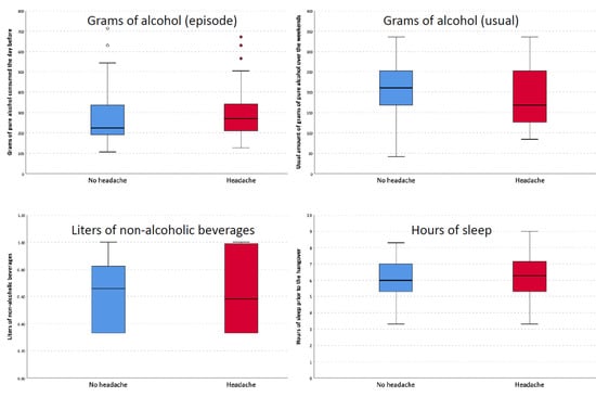 There were no differences in the amount of alcohol consumed the night prior to the episode (g), the usual amount of alcohol consumed (g), the volume of non-alcoholic beverages consumed (L), or the hours of sleep between participants who had headaches and the rest of the sample (Figure 2). In the univariate analysis (Supplementary Materials), the variables that were associated with the incidence of headache were a prior history of headaches (OR: 3.437; 95% CI: 1.347–8.775) and the average amount of pure alcohol (g) regularly consumed on weekdays (OR: 0.957; 95% CI: 0.922–0.993). The presence of a headache was also associated with a more prolonged duration of thirst as a hangover symptom (OR: 1.506; 95% CI: 1.086–2.088), a more prolonged duration of the difficulty in thinking or speaking normally (OR: 2.566; 95% CI: 1.254–5.247), and the presence of difficulty in reading or writing normally (OR: 2.830; 95% CI: 1.250–6.406). In the multivariate analysis (Table 1), the only variable that remained statistically significant was a prior history of headaches (OR: 3.480; 95% CI: 1.084–11.177).