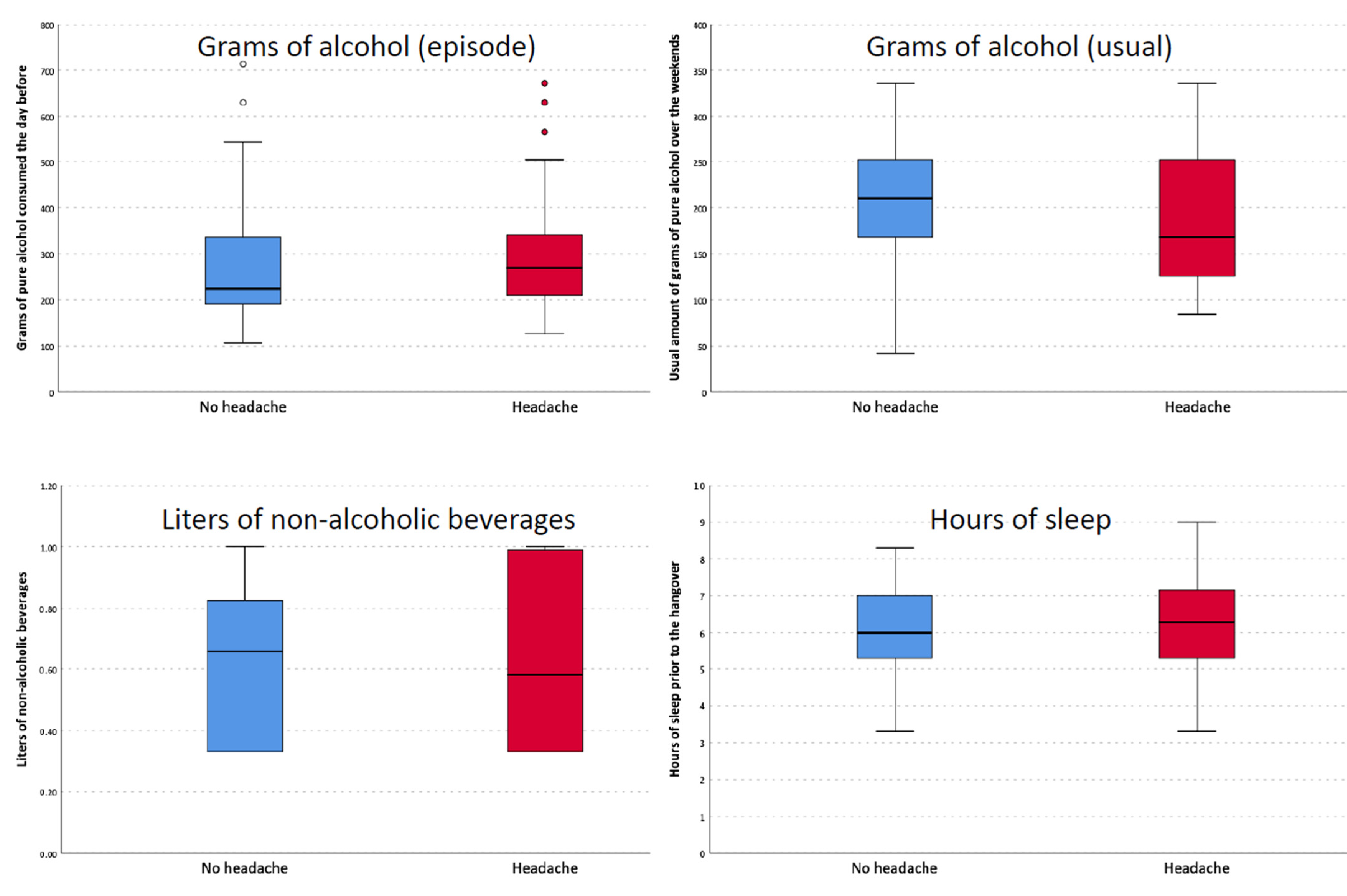 The present study has notable limitations. First, the sample size was modest, with only 32 participants and 96 alcohol consumption episodes. Prior studies with larger sample sizes detected differences, which were small, suggesting that the consequences of alcohol and the hangover phenotype may be affected by several factors []. The Hawthorne effect may have biased the results, since participants knew the purpose of the study and were instructed to report their activities and symptoms. The duration of the headache was shorter than that reported in other studies [], which could be related to the participants’ young age or the use of acute medications in 47% of cases. There is no population at a higher risk of memory bias than individuals exposed to alcohol. However, the prospective design of this study and systematic evaluation attempted to minimize the risk of recall bias. All participants completed the study and provided valid data, which permitted the adjustment for several relevant confounders. Larger studies may be able to delineate additional predictors of DAIH that this study was unable to see, contributing to the knowledge of how to avoid or minimize DAIH and thus reduce health-related disability and the economic burden caused by absenteeism and presenteeism.