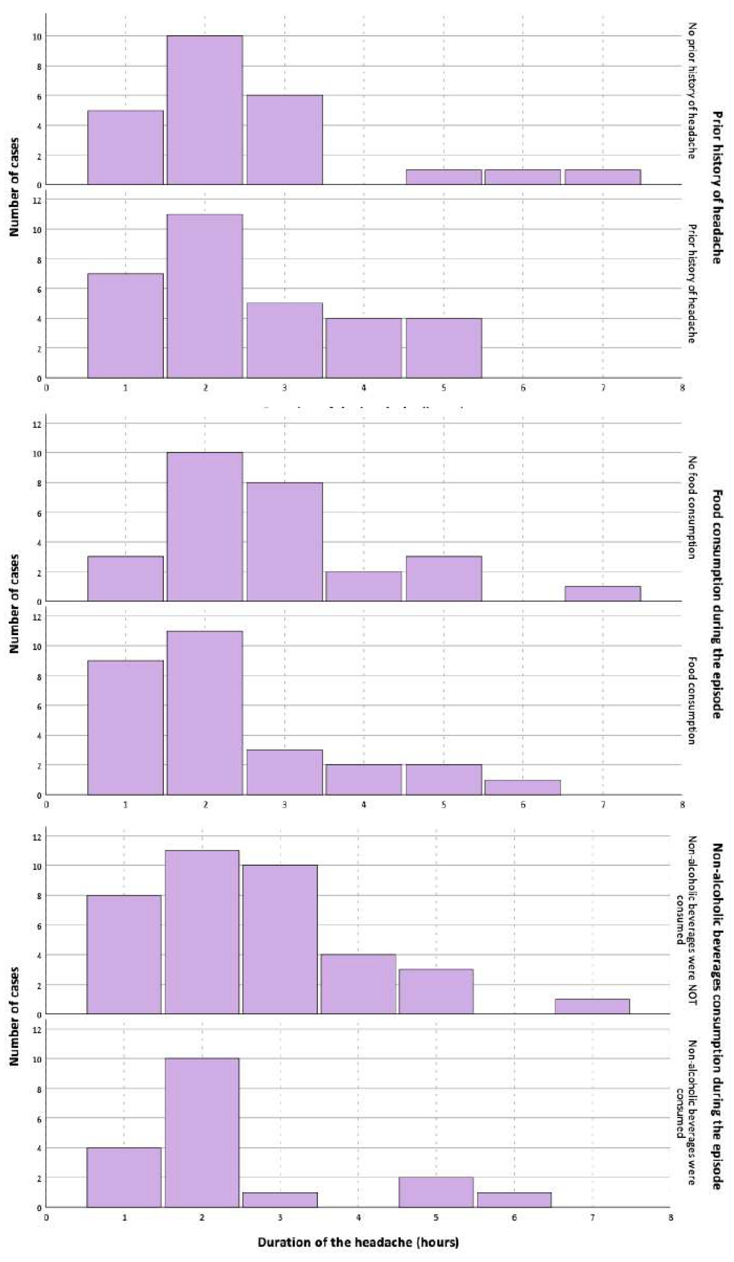 It is a common belief that some factors, such as proper hydration or food consumption, may prevent the incidence of headaches following alcohol consumption; however, this has not been demonstrated with scientific evidence []. In the present study, we aimed to evaluate which factors were associated with the presence of a headache as a hangover symptom in a cohort of individuals that voluntarily consumed alcohol. We prospectively collected data related to the intake of alcohol and other beverages or food, as well as systematic descriptions of hangover syndrome and the headache phenotypes and durations.