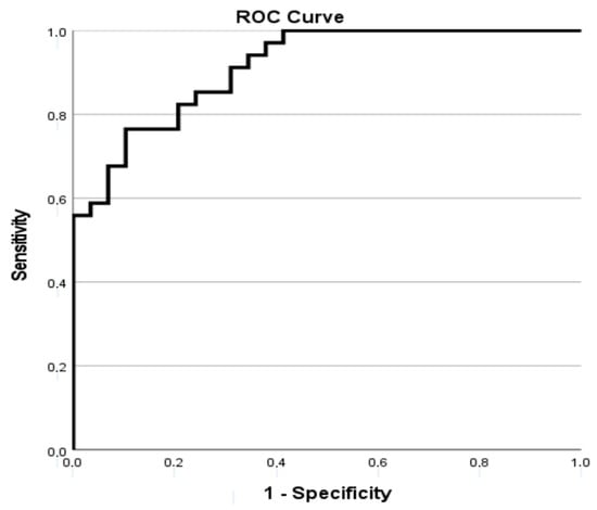 After exclusion of two extreme outliers, a logistic regression model was constructed to identify predictors of the 18-month composite outcome (death or transfer to HD). The final model satisfied all analytical assumptions, including the absence of multicollinearity and adequate linearity of continuous predictors. Internal validation demonstrated excellent discriminative ability (AUC = 0.913) and good calibration (Hosmer–Lemeshow test: χ2 = 1.366, p = 0.995). The ROC curve for this model is presented in Figure 1, demonstrating excellent discrimination between patients with and without adverse outcomes (AUC = 0.913). The model explained 66% of the variance (Nagelkerke R2 = 0.658) and achieved an overall classification accuracy of 79.4%. Variables included in the model were: sex, daily urine volume, Kt/V, NLR, TG, PTH, CRP, dialysis modality (CAPD vs. APD), log-transformed CCI, log-transformed period on PD, and standardized FAR.