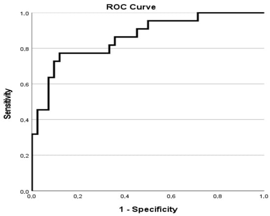 After excluding one extreme outlier, a second logistic regression model was constructed to identify predictors of 18-month mortality. As in the previous model, all assumptions were satisfied. The model demonstrated good calibration (Hosmer–Lemeshow test, χ2 5798, p = 0.670) and strong discriminative ability (AUC = 0.863). The corresponding ROC curve is presented in Figure 2, confirming good discrimination for mortality prediction (AUC = 0.863). It explained 49% of the variance (Nagelkerke R2 = 0.489) and achieved an overall classification accuracy of 82.8%. The same set of variables was included as in the composite outcome model.