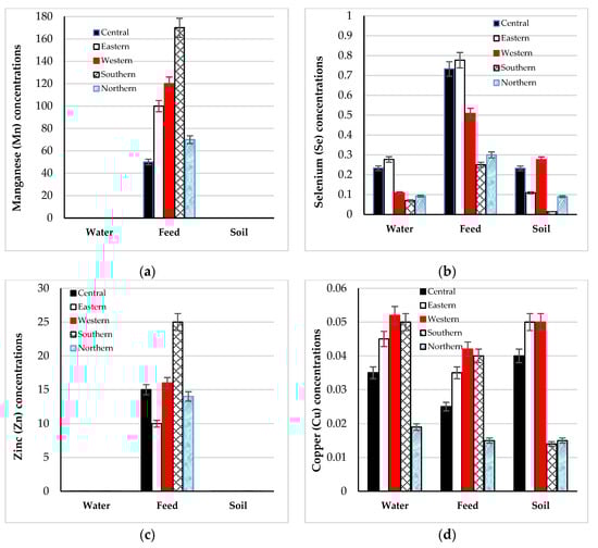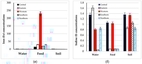 Trace mineral concentrations of (a) Mn, (b) Se, (c) Zn, (d) Cu, (e) Fe, and (f) iodine in drinking water (µg/mL), soil (ppb), and feed (µg/g) in five Saudi Arabia regions.