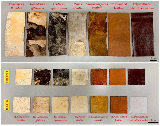 SEM offered significant information into the microstructural properties of the mycelium-like leather sheets compared with traditional cow leather and PU microfiber leather (Figure 5). The overall surface textures of the mycelium-derived materials revealed unique natural patterns that closely simulate the textured appearance of animal leather, with some species such as L. squarrosulus, P. similis, and S. vaninii displaying more consistent and compact surface morphology. The front surfaces of the mycelium sheets exhibited a dense network of interwoven hyphae, forming a continuous and cohesive mat. This interconnected hyphal arrangement is essential for imparting mechanical strength, flexibility, and the leather-like feel that is desirable for fashion applications [12,44].