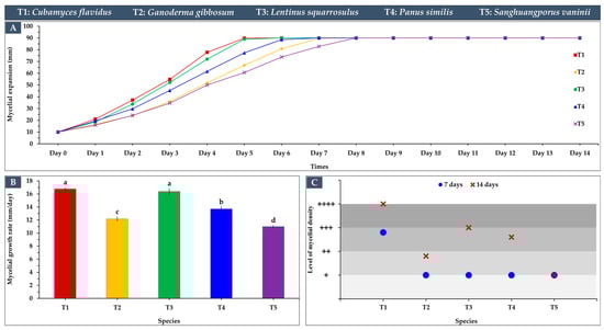 Mycelial growth characteristics of five edible and medicinal mushroom species cultivated on sawdust substrates: (A) mycelial expansion patterns, (B) growth rate across the incubation period (means ± SD), with statistical differences indicated by letters (a–d) using Duncan’s multiple range test (p ≤ 0.05), and (C) mycelial density levels.