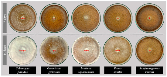 Sawdust was combined with the nutritional supplement for mushroom growing (5% rice bran, 1% calcium carbonate, 2% calcium sulfate, and 0.2% sodium sulfate). The mixtures were then adjusted to 60% relative humidity by adding water. A 10 g portion of each substrate mixture was placed onto a glass plate (90 mm in diameter) and sterilized at 121 °C for 60 min. After cooling, a 10 mm mycelial disk was placed at the center, and plates were incubated at 30 °C for 14 days [18]. Mycelial growth was measured daily by recording the colony diameter along two perpendicular axes, and the radial growth rate (mm/day) was calculated based on the increase in average colony diameter over time. Growth density was evaluated on day 7 and at the end of incubation, classified as very thin (+), thin (++), thick (+++), or very thick (++++) following the criteria described by Raman et al. [12]. Each treatment was conducted in five replicates.