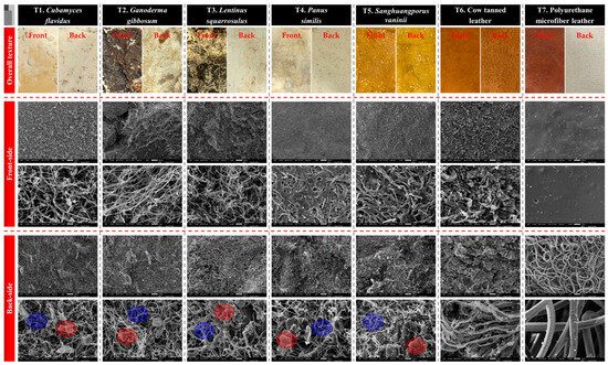Scanning electron microscope images showing the surface structures of mycelium-like leather sheets derived from the mycelia of five edible and medicinal mushroom species within study, as versus traditional synthetic and animal leathers. The front and back surfaces are presented, with blue highlights indicating areas of pure mycelium, while red highlights mark regions on the backside where sawdust particle residues remain.