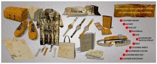 Looking ahead, scaling up production through an adjusted process, particularly by increasing the size and length of mushroom spawns, will available the generation of larger mycelium-like leather sheets. These innovations will be integrated into the design and production of stylish, fully biodegradable prototypes, such as shoes, wallets, jackets, handbags, hats, handmade watch straps, belts, notebook covers, leather box sets, keychains, sheets, and other fashion accessories and garments (Figure 8). These next steps are essential to validating the material’s real-world performance, design versatility, and consumer appeal. Ultimately, this approach supports the change toward a circular fashion economy, reducing the environmental footprint of synthetic leathers and decreasing reliance on traditional animal-based products.