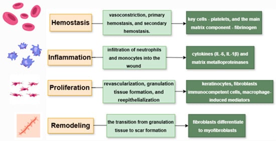 Wound healing, one of the most complex processes in the human body, proceeds through four overlapping phases: hemostasis, inflammation, proliferation, and remodeling (Figure 2).