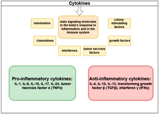 Cytokines are the principal signaling molecules involved in the body’s response to inflammation and in the regulation of the immune system. They are classified into interleukins, chemokines, interferons, tumor necrosis factors, growth factors, and colony-stimulating factors. The classification of cytokines is presented in Figure 3.