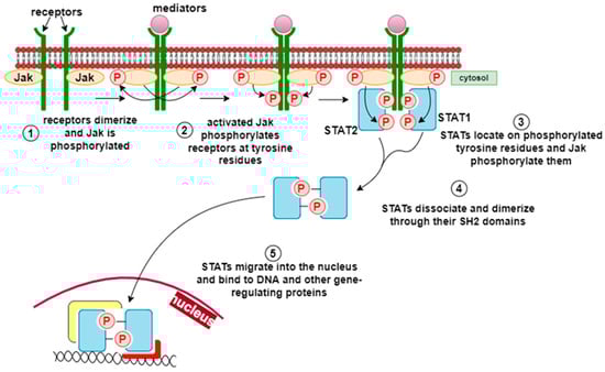 JAK/STAT (Janus kinase/signal transducer and activator of transcription) is a signaling pathway used by multiple cytokines, growth factors, and interferons and is closely associated with cell proliferation, apoptosis, differentiation, and inflammatory responses []. The binding of mediators to cytokine receptors leads to cytokine-receptor interactions in the cytoplasmic domain, which induces phosphorylation of JAK and STAT proteins. Activated STAT proteins form dimers that translocate to the nucleus and modulate the expression of specific cytokine-responsive genes (Figure 6) []. This pathway is essential for the suppression of the inflammatory process, the initiation of innate immunity, and the coordination of adaptive immune mechanisms. Flavonoids such as curcumin, quercetin, and several types of plant polyphenolic compounds act at different levels of this pathway to suppress its abnormal activation [].