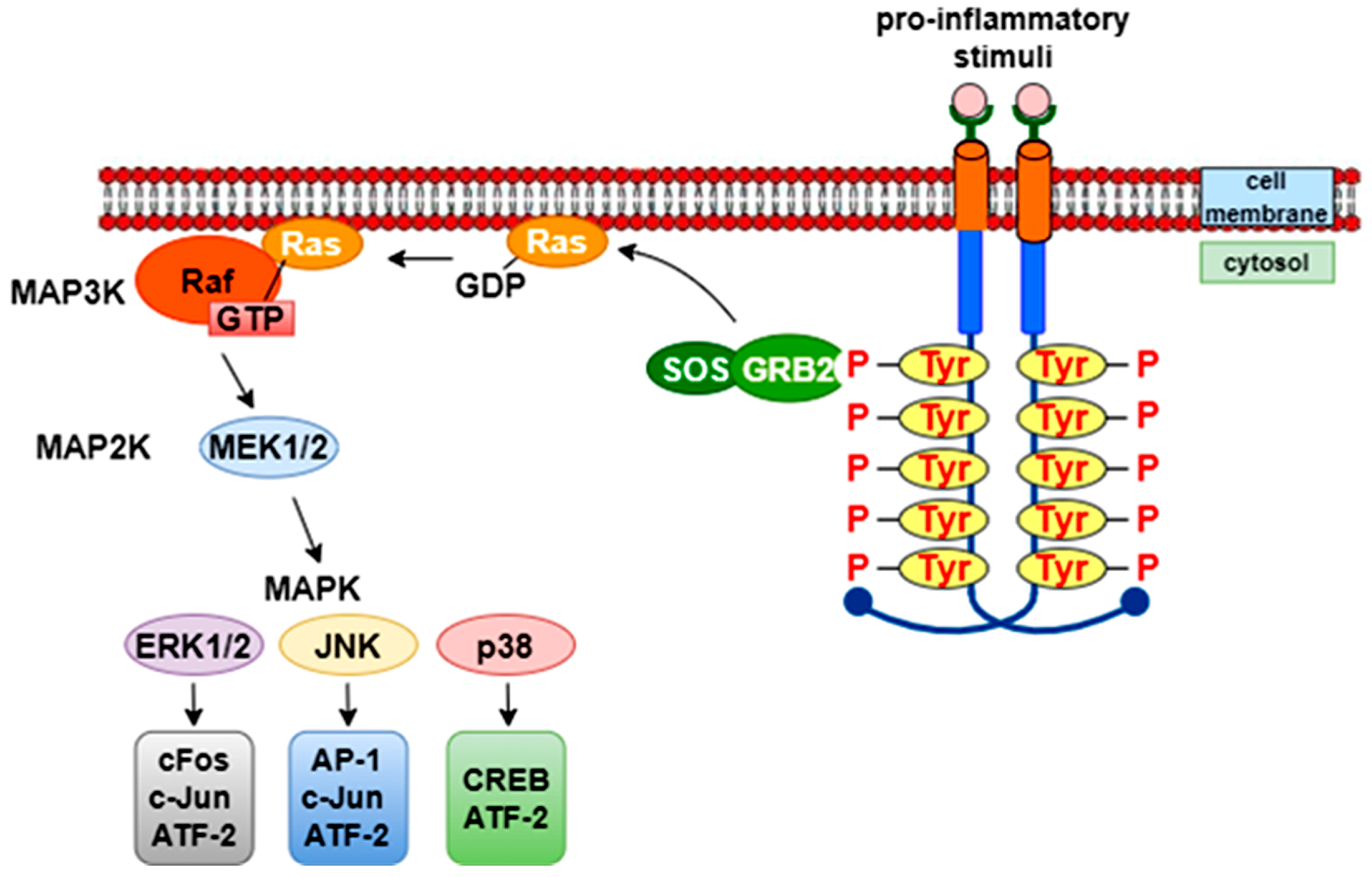 - Kaminska, B. MAPK Signalling Pathways as Molecular Targets for Anti-Inflammatory Therapy—From Molecular Mechanisms to Therapeutic Benefits. Biochim. Biophys. Acta 2005, 1754, 253–262. [Google Scholar] [CrossRef]