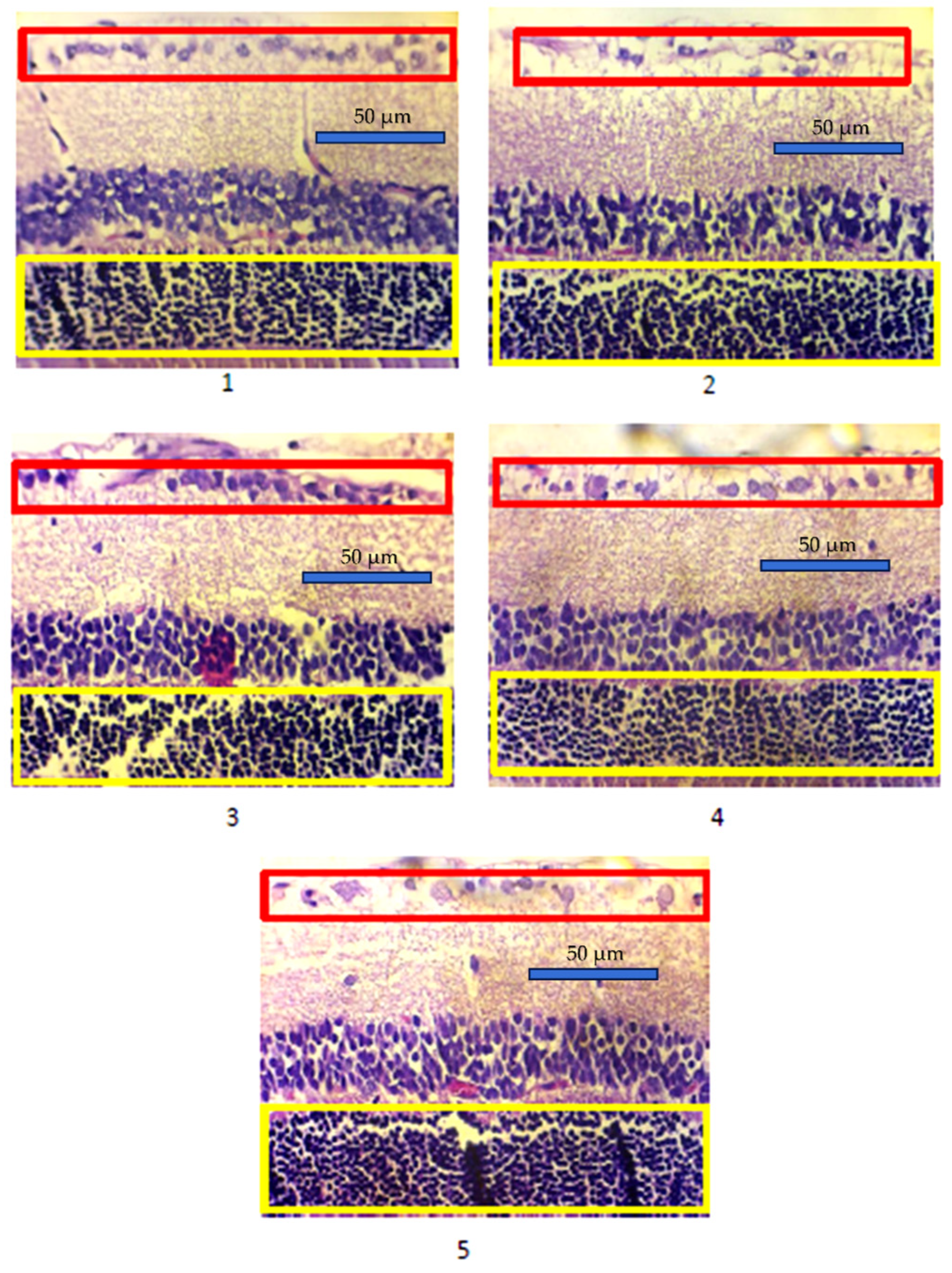 3.2. Photoreceptor Cell Density and Retinal Ganglion Cell Density in Experimental Animals