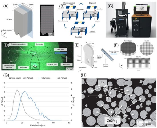 The test specimens discussed in this paper are made of pre-alloyed Zn-1Mg powder from the manufacturer Nanoval GmbH und Co KG (Berlin, Germany) with a particle size distribution (PSD) of +15 µm/−45 µm. The validation of the material specifications is carried out with a particle analyzer of the Camsizer X2 model from the company Retsch (Haan, Germany). The PSD in terms of number (q0) and volume (q3) is shown in Figure 1A.
