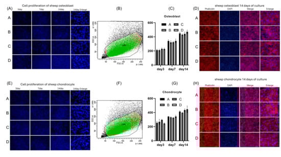 Figure 2A,E shows that the number of cells increased as time went by from 3 days to 7 days and 14 days. The cell nucleus had regular morphology and the cells on the surface grew healthily. We then used ImageJ (version: 1.53v) software to calculate the difference in cell number between the groups. As shown in Figure 2C,G, there was no statistical difference in the growth of osteoblasts and chondrocytes among the groups. We then used Zombie Violet to mark dead cells and performed flow cytometry analysis. Figure 2B,F shows that green fluorescence indicated live osteoblasts, red fluorescence indicated dead osteoblasts, while black dots represented non-cellular particles. The figure shows a high survival rate across all four groups.